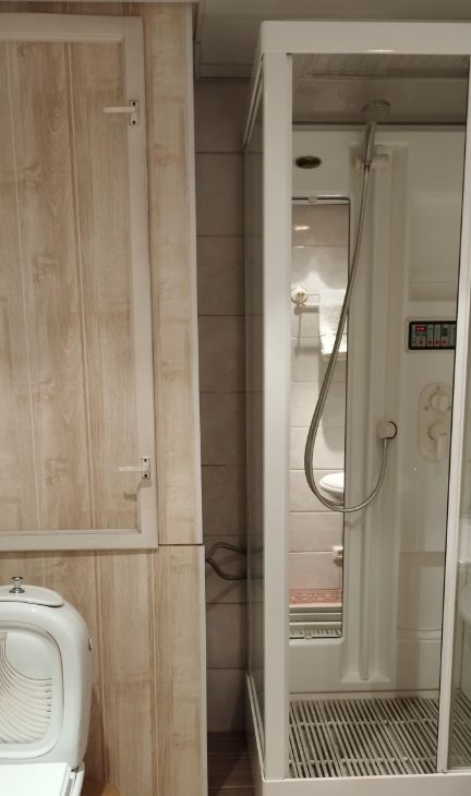 Кроме санузла в ванной комнате есть отдельный санузел с умывальником и с душевой кабиной той же фирмы Jacuzzi с душем Шарко.
