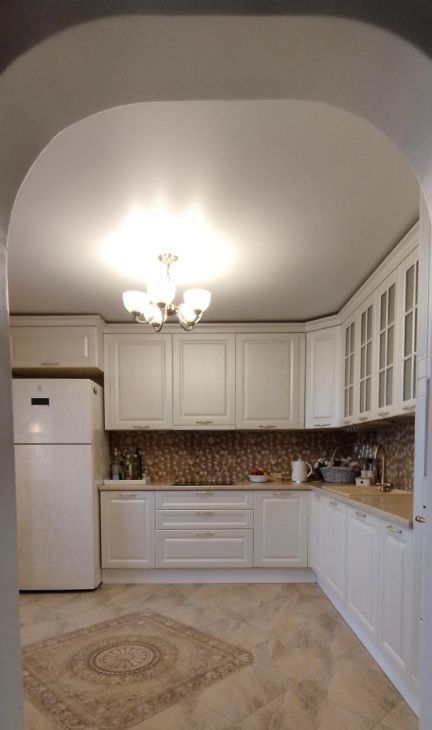 Кухня оборудована современной техникой, включая большой турецкий холодильник и встроенную посудомоечную машину на большую семью. Жарочный шкаф и микроволновка в одном стиле с фасадом кухни. Обеденный стол на 2-4 человека встроен в интерьер кухни, имеет несколько вариантов подсветки итальянских светильников. Вытяжка выведена в вентиляционную шахту.