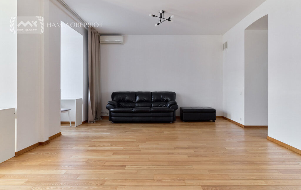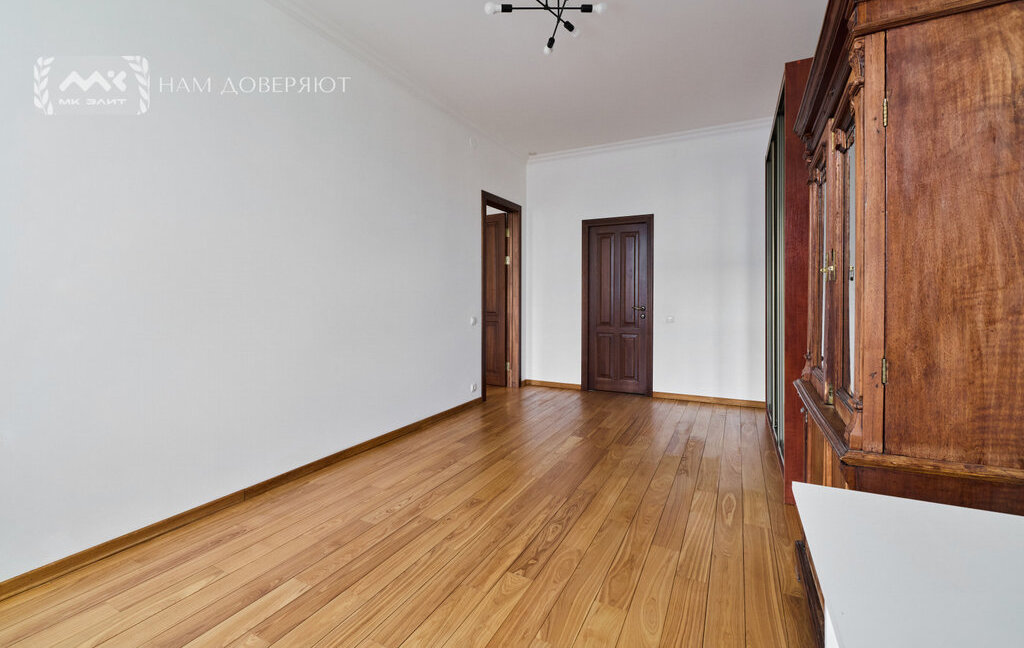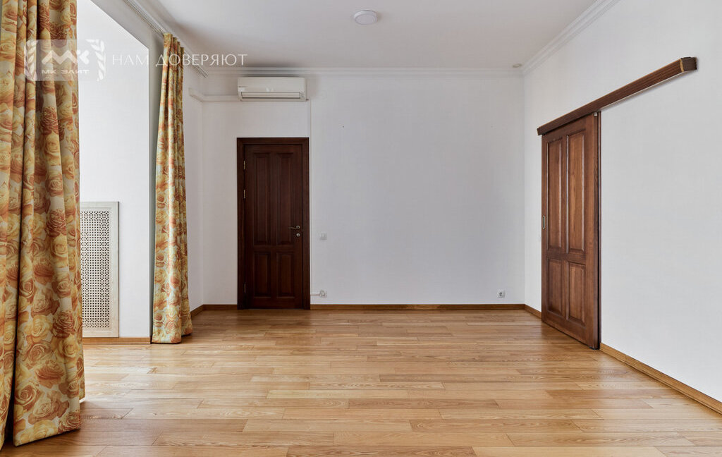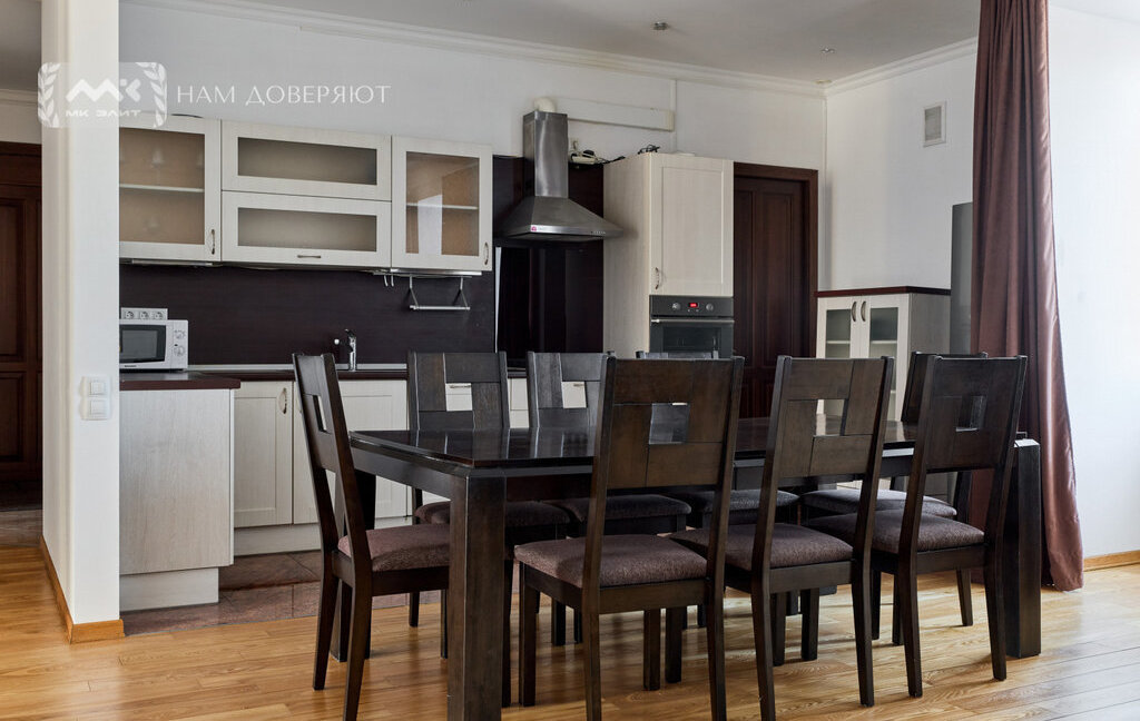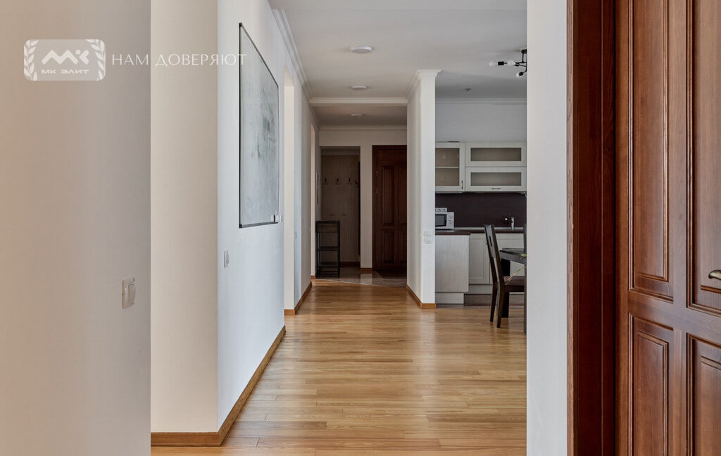 Интерьер выполнен из качественных материалов: на полу массивная доска из ясеня, двери из массива ореха, в прихожей и кухне используется итальянский гранит, подоконники из мрамора "Бьянка каррара". Теплый пол в зонах с камнем и плиткой. Установлены кондиционеры.