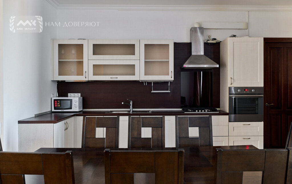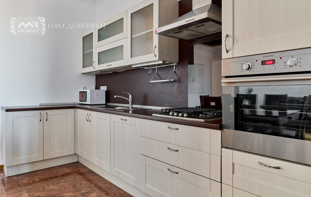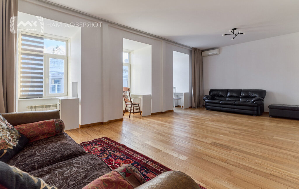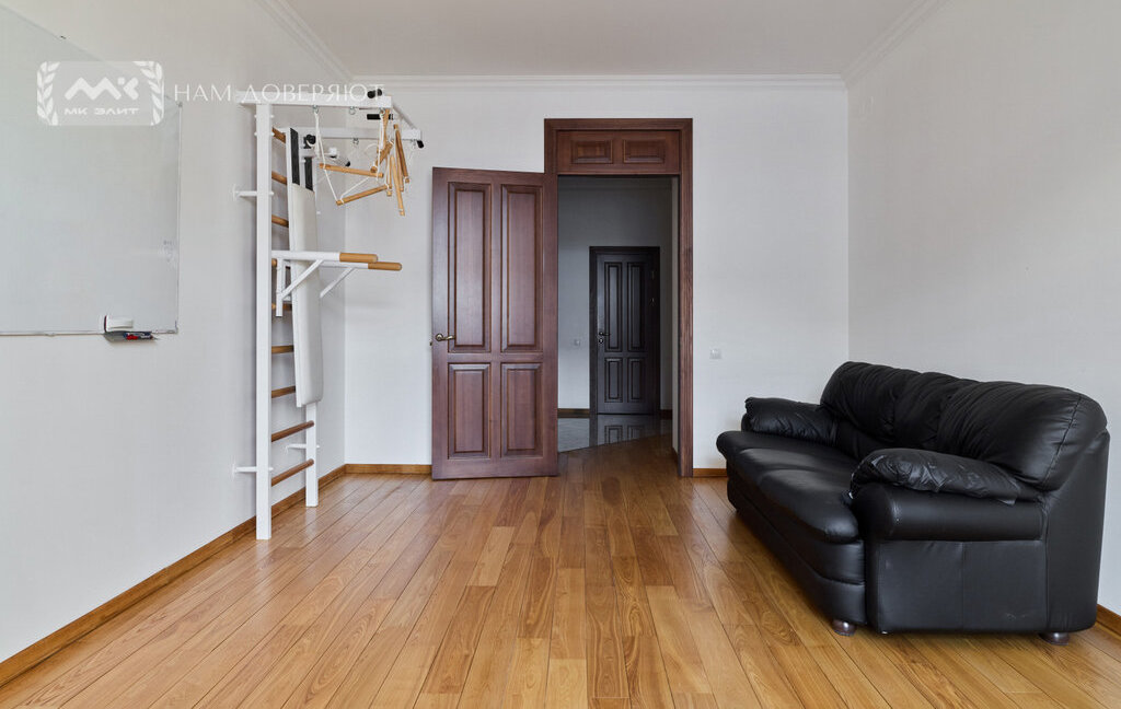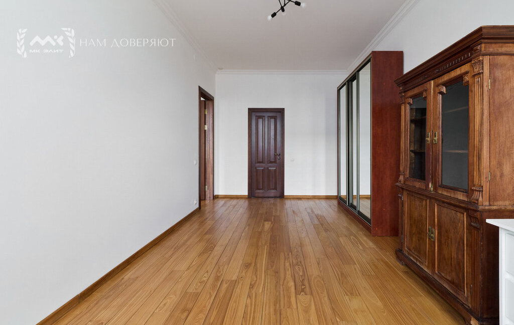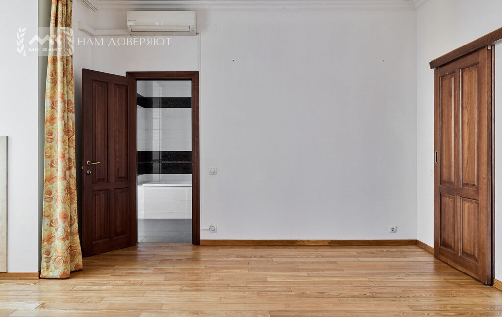 Интерьер выполнен из качественных материалов: на полу массивная доска из ясеня, двери из массива ореха, в прихожей и кухне используется итальянский гранит, подоконники из мрамора "Бьянка каррара". Теплый пол в зонах с камнем и плиткой. Установлены кондиционеры.