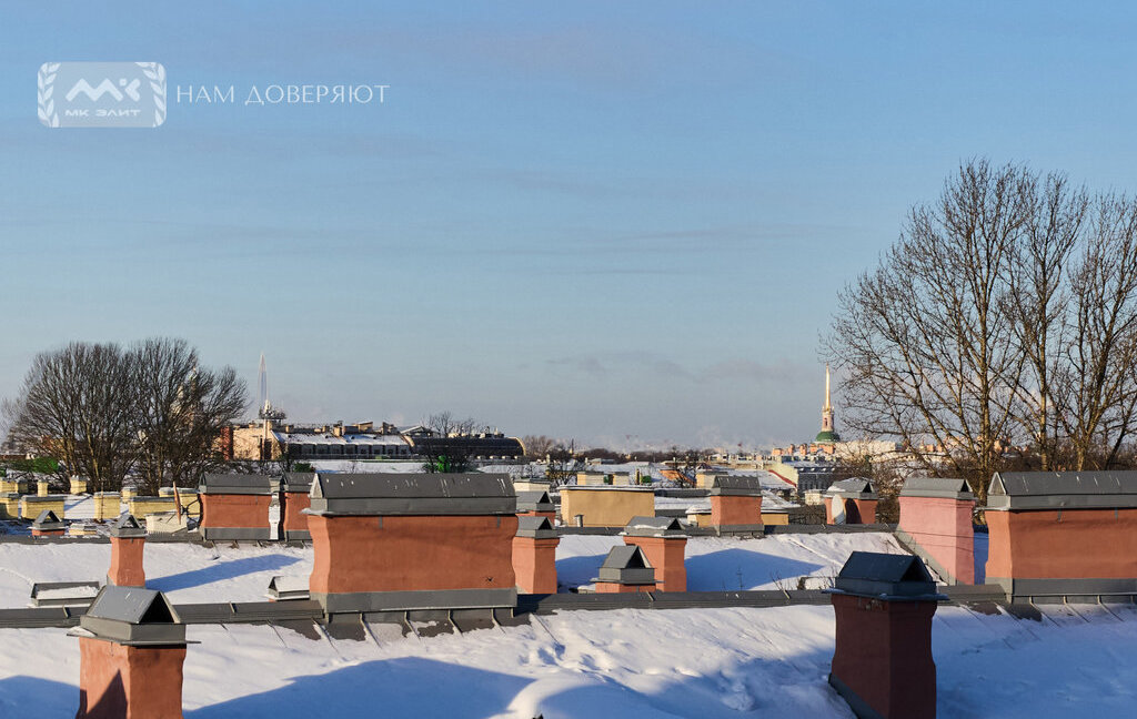 Планировка предусматривает кухню-столовую, четыре спальни, включая главную мастер-спальню с большим окном в санузле, два отдельных санузла, гардеробную в прихожей и кладовую комнату. Квартира располагает окнами на юго-восток и запад, благодаря чему в помещении много естественного света, открываются панорамные виды на Исаакиевский собор, Казанский собор, Спас-на-Крови, Михайловский замок и Петропавловскую крепость, а также видны потрясающие закаты и городские фейерверки.