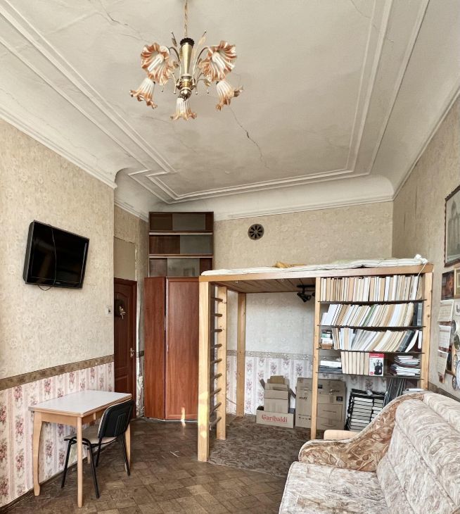 Просторная, светлая комната с огромной высотой потолка, что позволило сделать второй ярус для спальной зоны, тем самым увеличив полезную площадь, имеет ещё и большой тамбур перед входом, который служит не только дополнительной шумо изоляцией, но и позволяет хранить вещи, превращаясь практически в гардеробную зону.