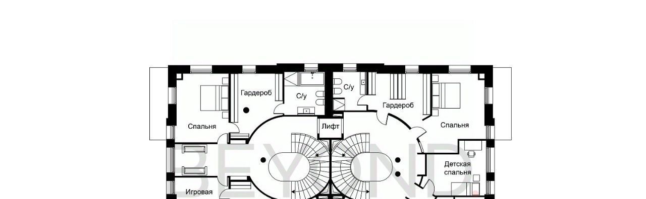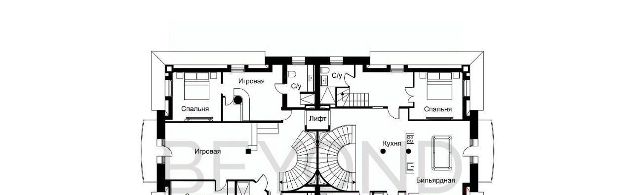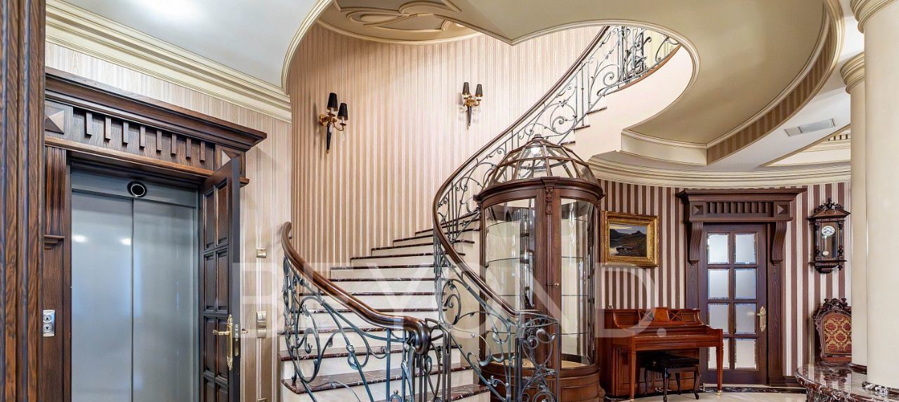 Дом включает четыре уровня с лифтом и объединяет две автономные функциональные половины. На цокольном уровне — SPA-зона с бассейном, сауной, хаммамом и холодильной комнатой для хранения меховых изделий.