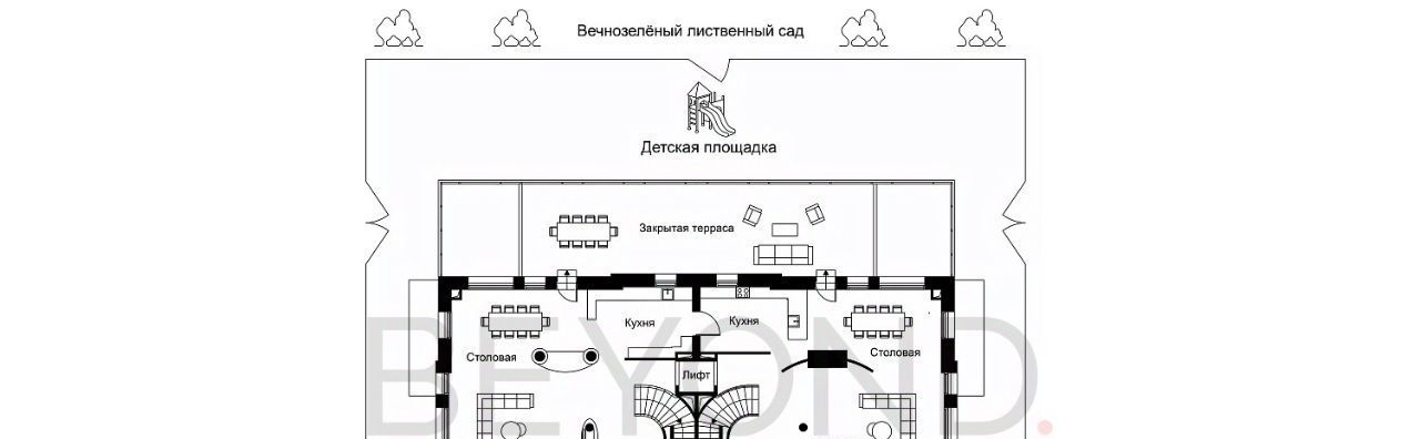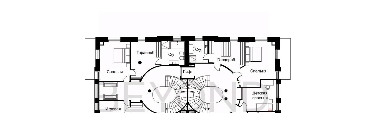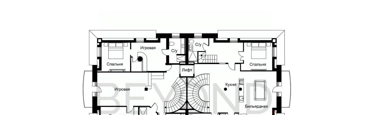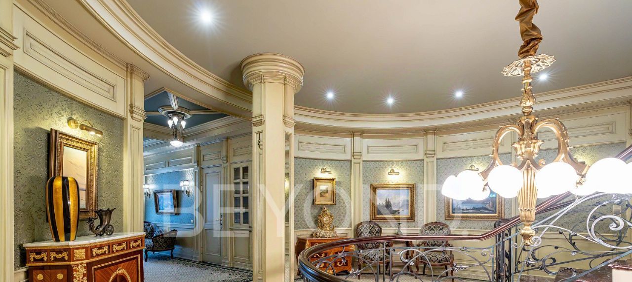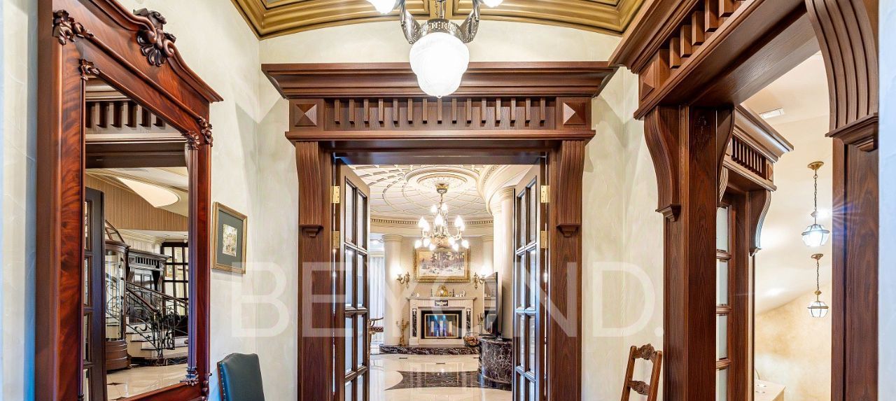 Дом включает четыре уровня с лифтом и объединяет две автономные функциональные половины. На цокольном уровне — SPA-зона с бассейном, сауной, хаммамом и холодильной комнатой для хранения меховых изделий.