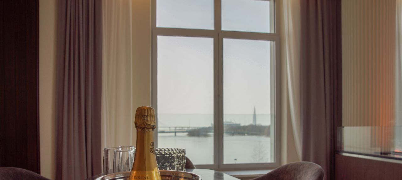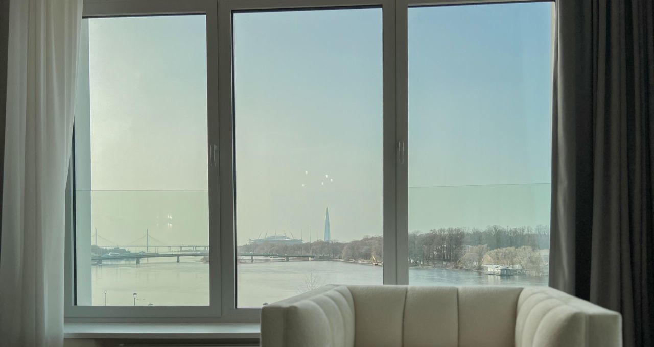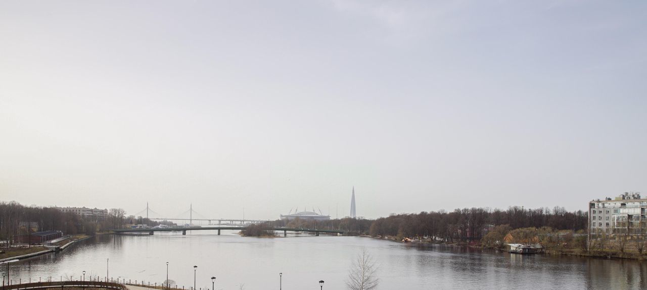 Вид: на залив , Газпром Арену, Лахта-центр и реку Малая Невка