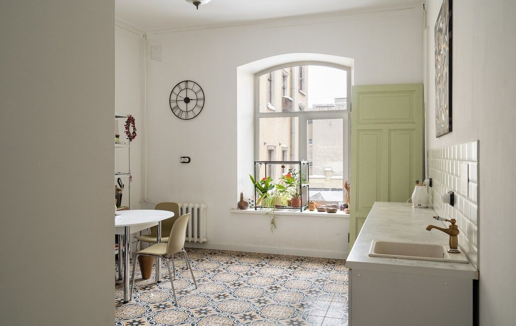 - Просторная кухня площадью 23 квадратных метра с большим окном.