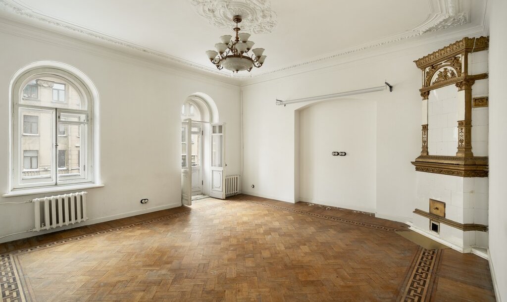 Квартира, в которой Прокофьев слушал Шостаковича: парадный вход, 5 печей, арочные окна, анфилада, наборный паркет, лепнина и балкон.