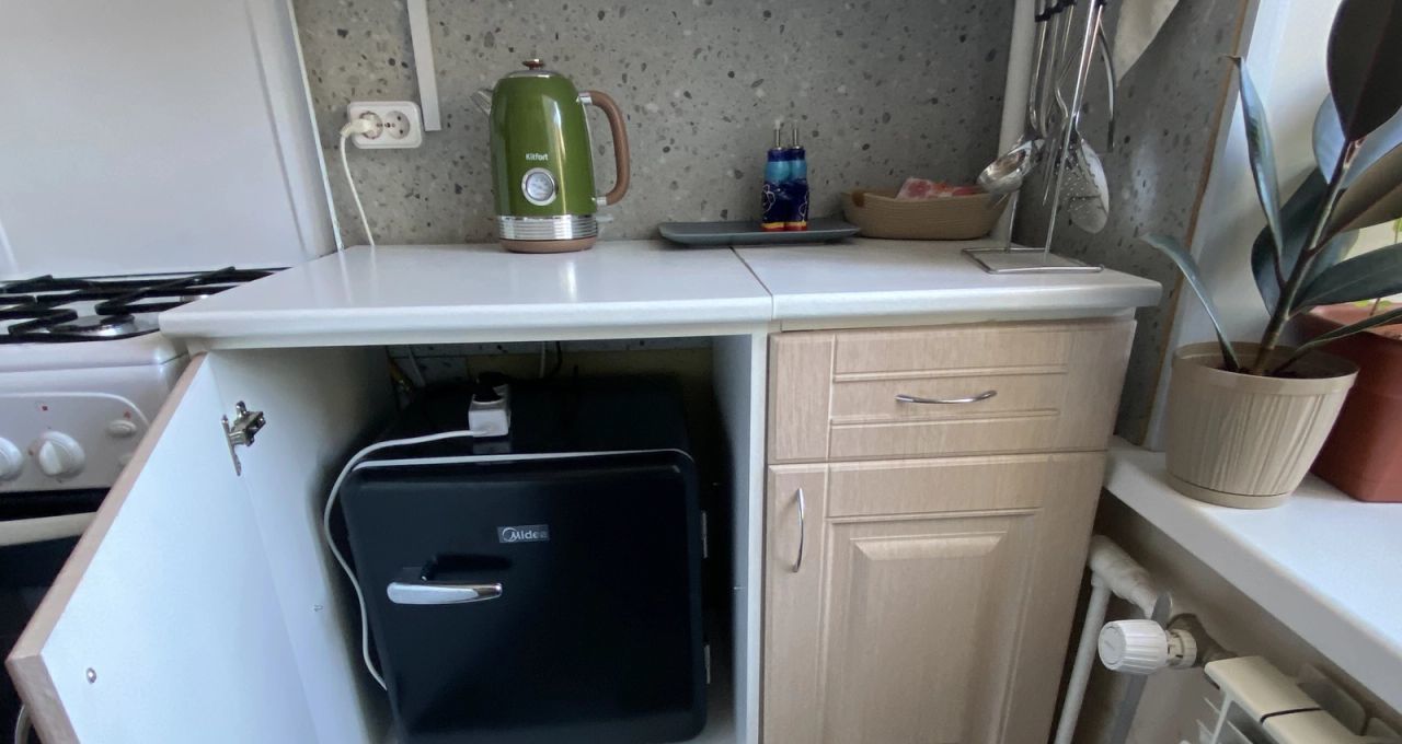 Есть необходимая мебель и техника: двуспальная кровать с ортопедическим матрасом, шкаф-купе, комод, чайник, холодильник. Свое место на кухне.