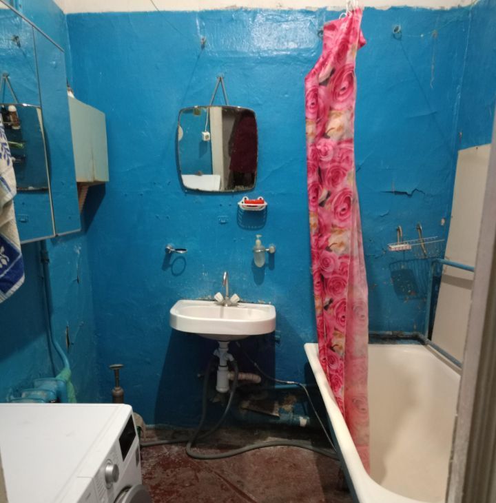 В комнате сделан косметический ремонт, установлены стеклопакеты, окна выходят во двор колодец. Мебель: двуспальный диван, стенка советского образца, два стола, шкаф для одежды. На кухне свои газовая плита, стол, навесной шкафчик, стиральная машина, в примыкающей общей маленькой комнате свой холодильник.