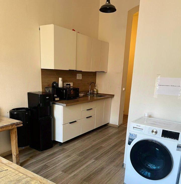 На этаже доступна просторная Кухня/Столовая зона со всей необходимой посудой, кулером и микроволновкой. Там же находится стиральная машина.