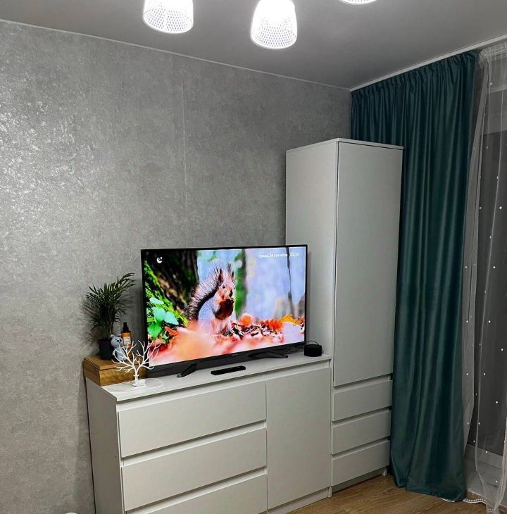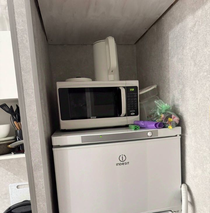 Из техники имеется своя стиральная машинка, холодильник, микроволновая печь , электрический чайник, обогреватель при необходимости, смарт-телевизор. В комнате есть вся необходимая мебель для комфортного проживания: обеденный стол с 2-мя стульями, буфет для посуды и приготовления легкого перекуса, раскладной диван, тумба под тв с выдвижными ящиками, шкаф пенал и распашной шкаф на лоджии, хоз.инвентарь для уборки. Так же есть некоторые предметы посуды. В коридоре имеется тумба с выдвижными ящиками и дополнительный шкаф. Около раковины находится дополнительный шкафчик для хозяйственных средств. Комната закрывается на ключ.