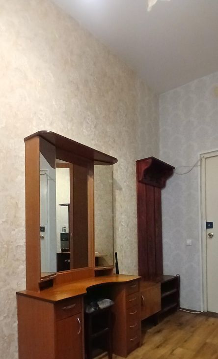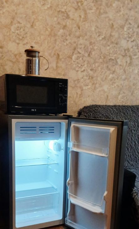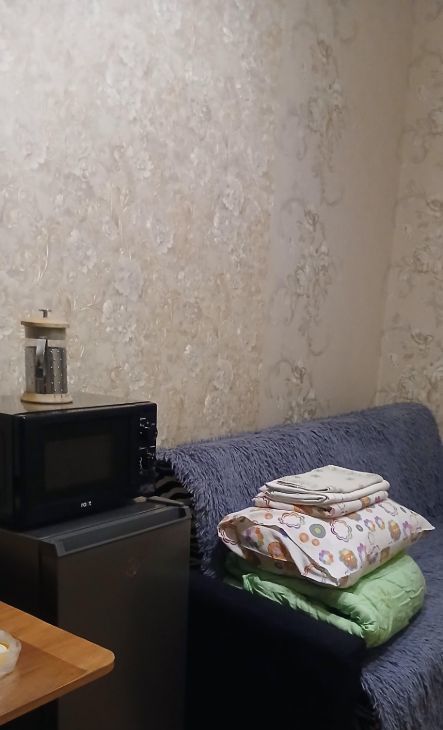 В КОМНАТЕ: новая бытовая техника (холодильник, микроволновая печь), диван-книжка раскладной, туaлeтный столик, шкаф угловой с зеркалом, стол раздвижной, прихожая, гладильная доска, табуреты, тумба, весь необходимый набор посуды, чистые постельные принадлежности (подушки, одеяла, плед), постельное белье, предметы для уборки. На кухне свое место с белым кухонным гарнитуром и посудой. В наст. момент в комнате произведен полный клининг!