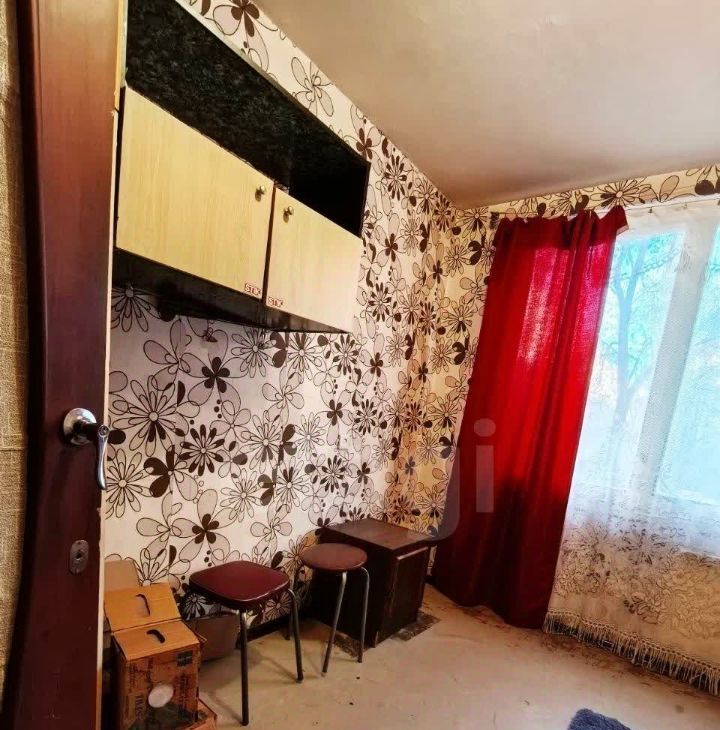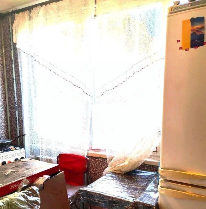 Комната широкая, с окном большим. Есть диван, шкаф. Кухня небольшая. Холодильник, плита, шкафчики. Все есть.