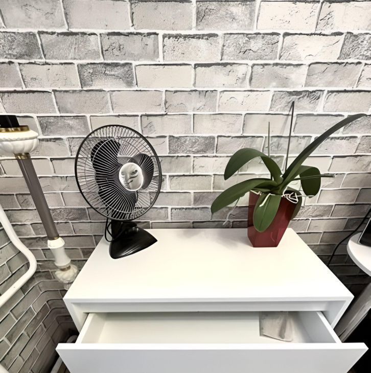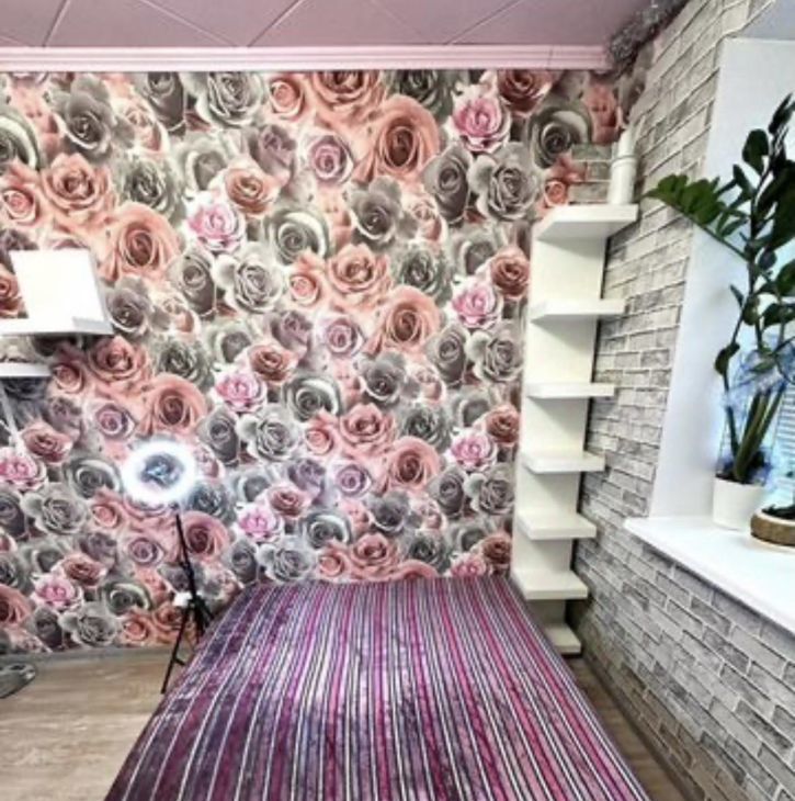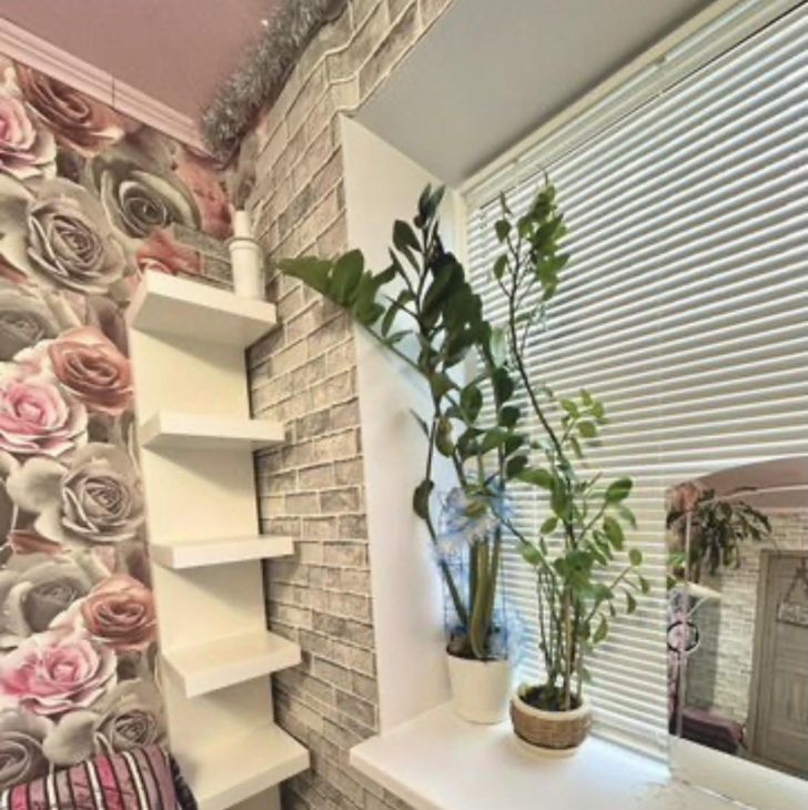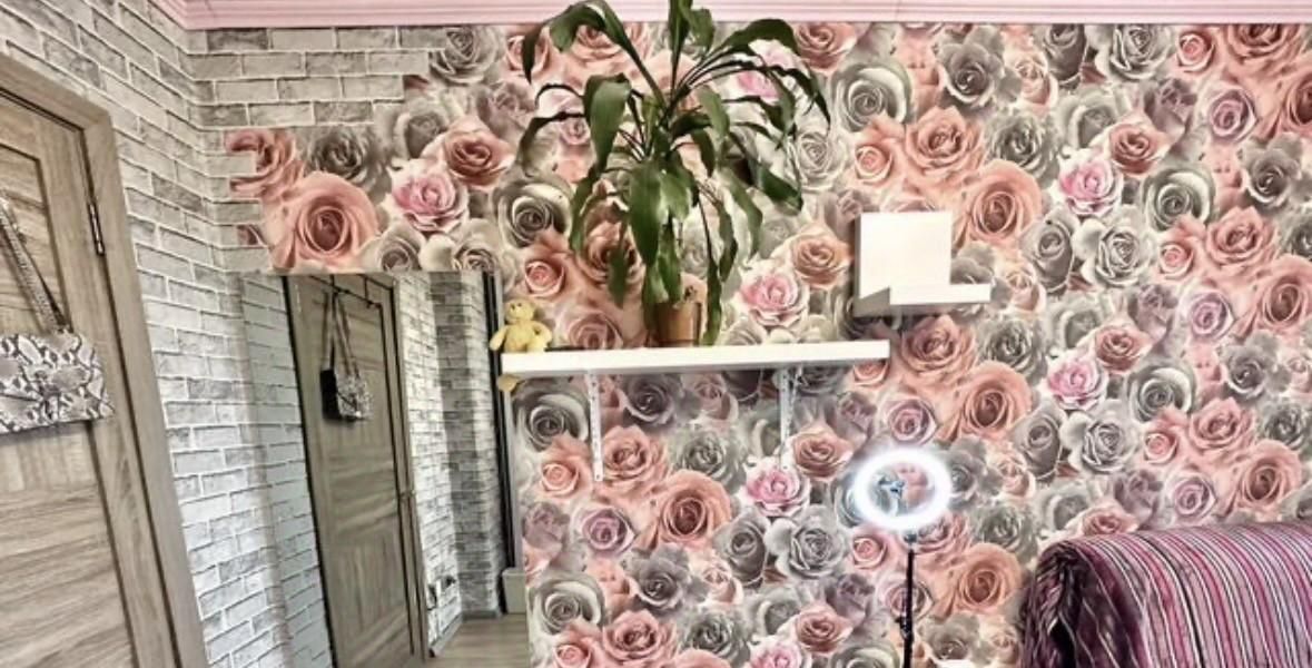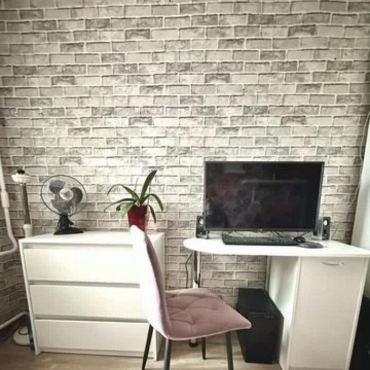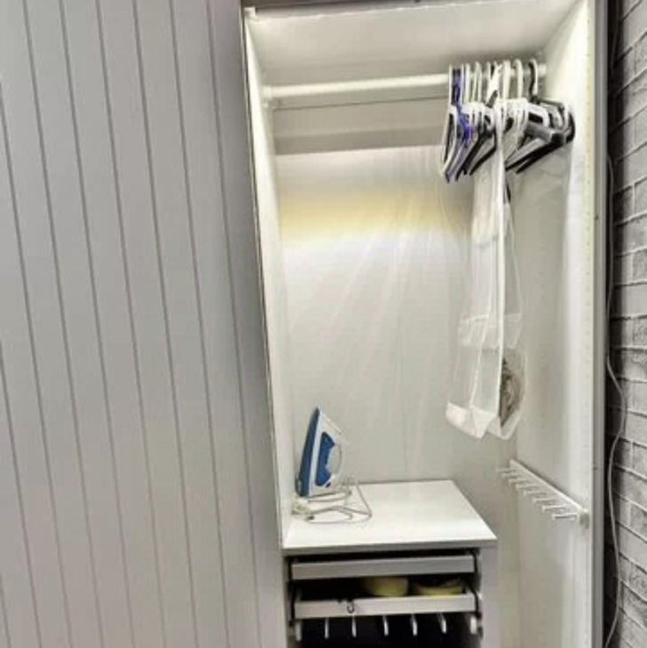В комнате есть диван-кровать, шкаф-купе икея с подсветкой, комод, весы напольные, пуфик, телевизор, стол с встроенной тумбой, полка угловая и настенная, жалюзи, утюг, зеркало и настенное зеркало, лампа кольцевая, микроволновка, чайник.