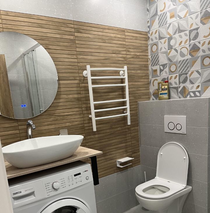 Санузел совмещённый. Есть гигиенические принадлежности, фен. Стиральная машина и порошок.