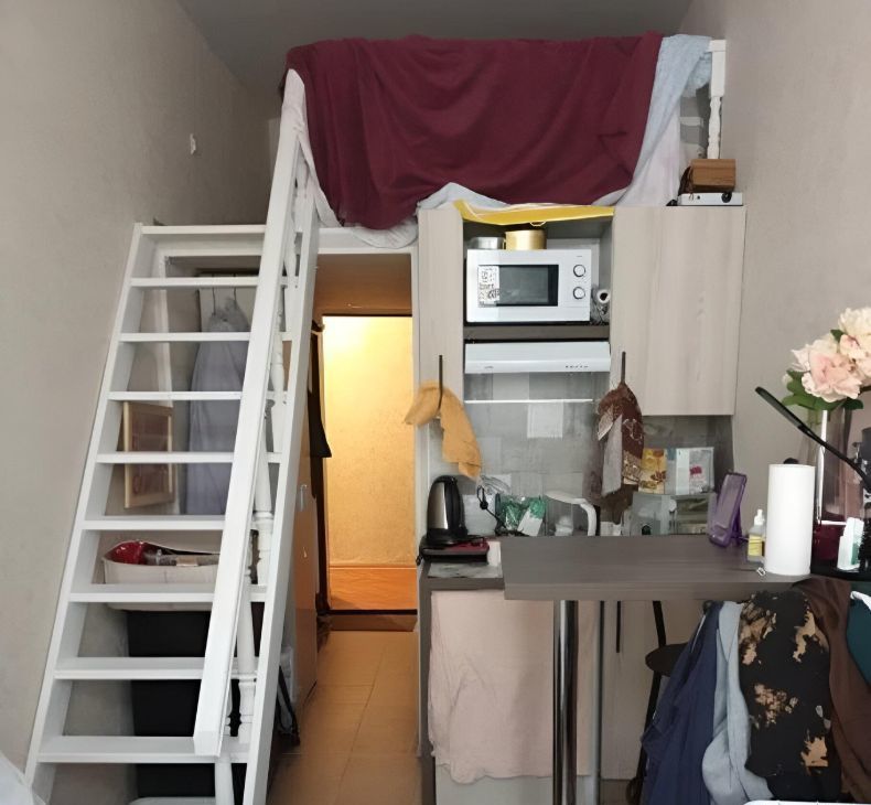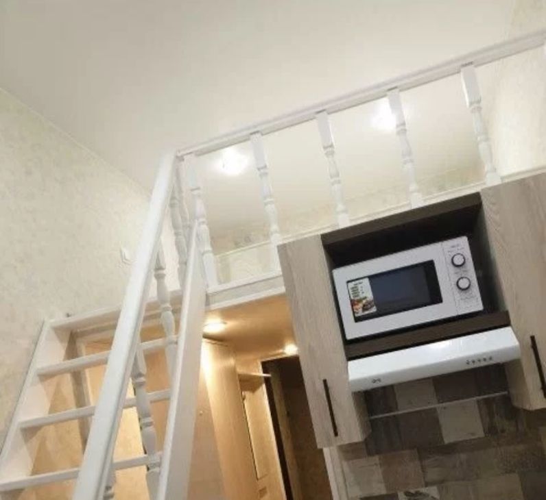 Небольшая площадь студии прекрасно компенсируется дополнительной надстройкой "этажом" с удобным двухспальным местом, что создает две отдельные зоны - основную (мини кухня и диван с телевизором) и компактную спальную (на втором ярусе).