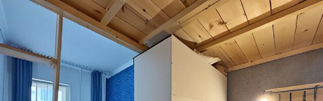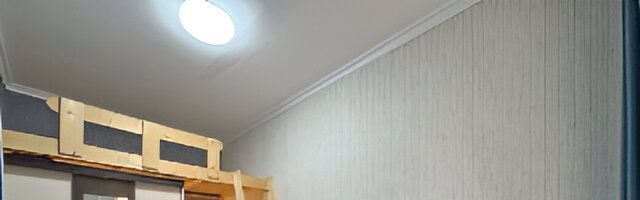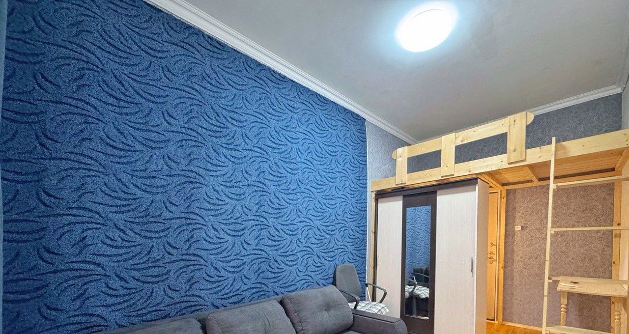 Комната с высокими 3-метровыми потолками и удобным вторым уровнем, на котором расположено спальное место (матрас имеется, на фото не отображён). Внизу диван и шкаф, пространство светлое и уютное.