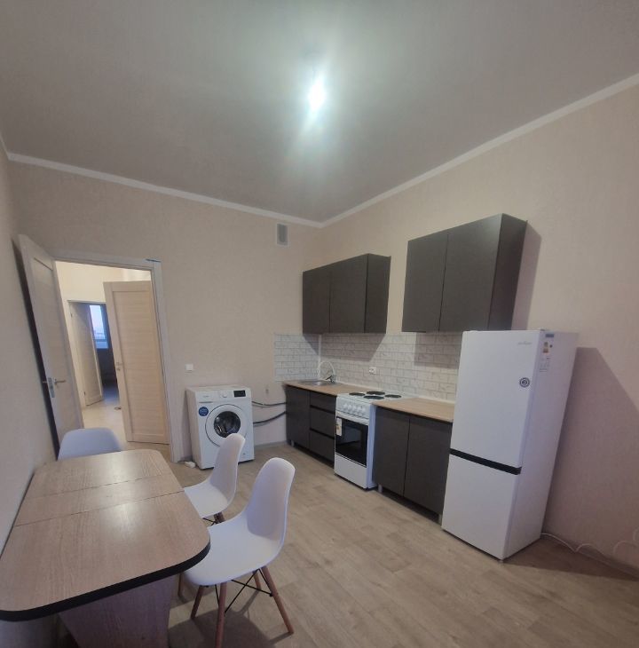Есть хoлодильник и cтиpальная машинкa. Также обеденный стол и четыре стула.