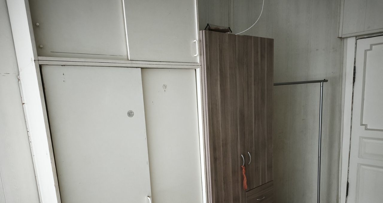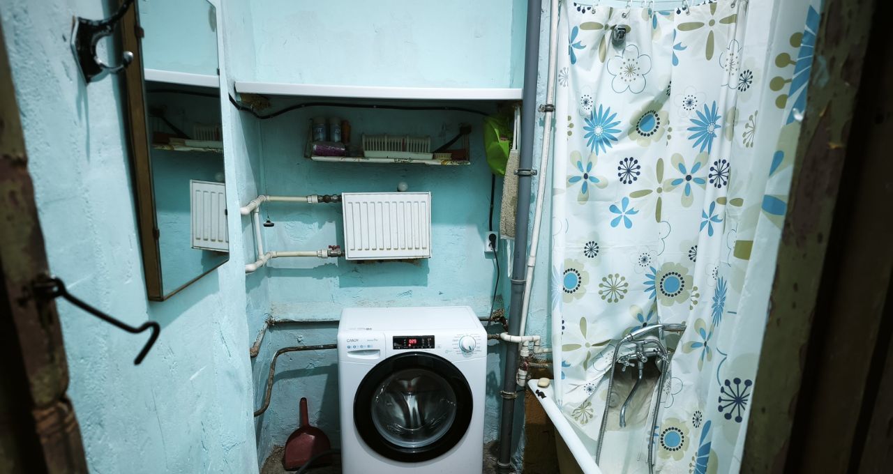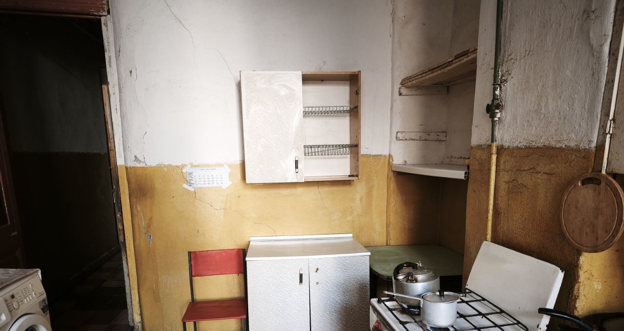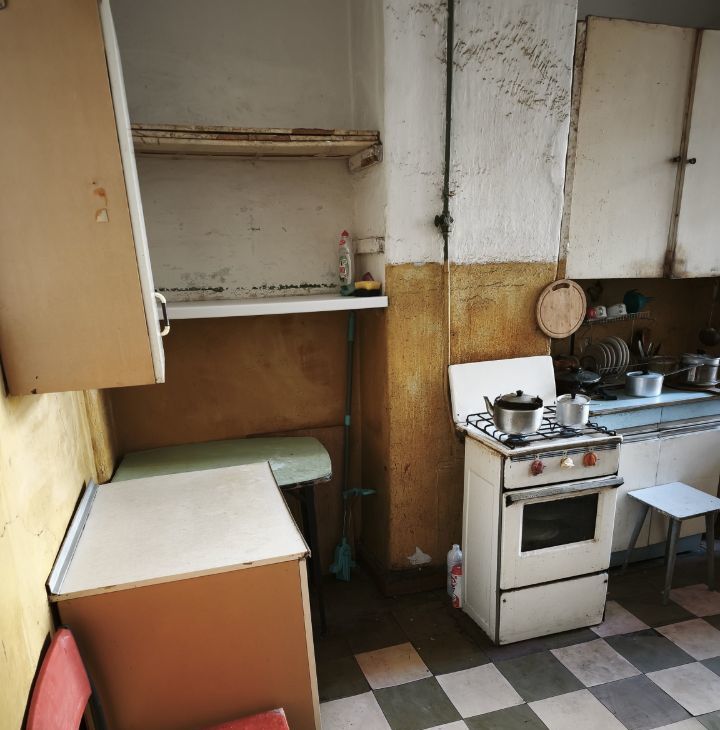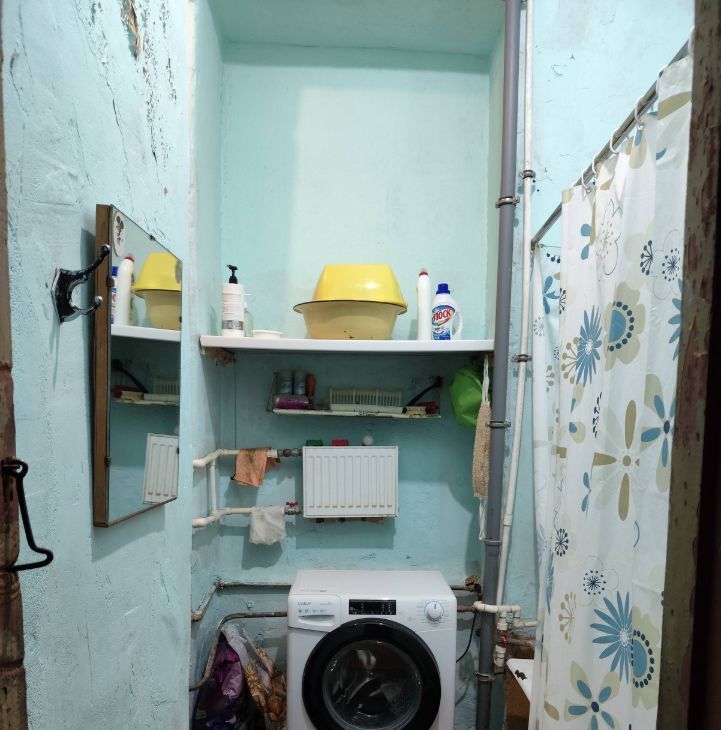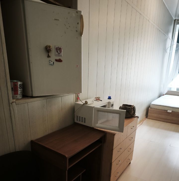 Комната уютная, с высоким потолком и большим окном, много света и воздуха. Удобная планировка. Есть готовое спальное место, место для хранения, холодильник, микроволновая печь, тумбы, вешало, стулья. Так же, можно разместить рабочую зону. Собственная стиральная машина,место на кухне . Плита газовая на двоих.