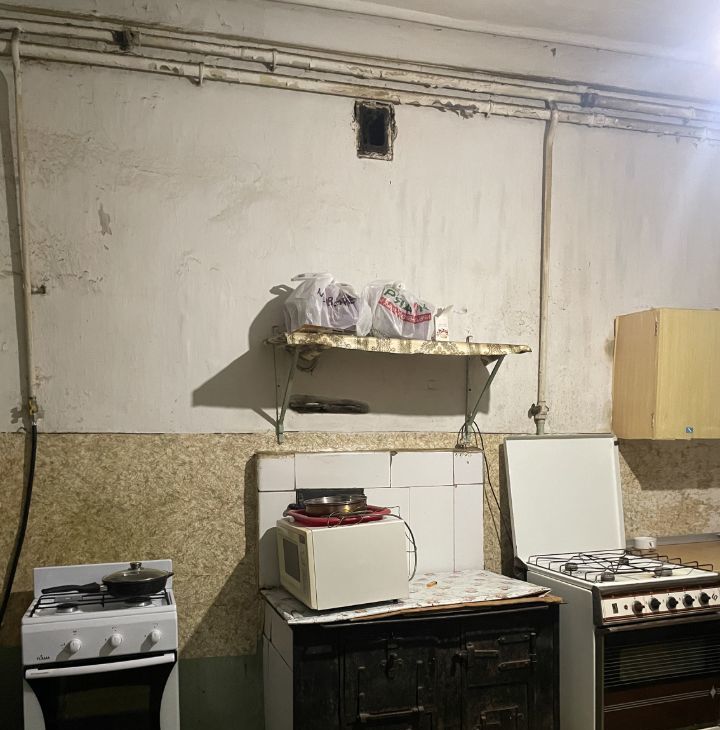 Кухня оснащена также , 2 плиты и столы .