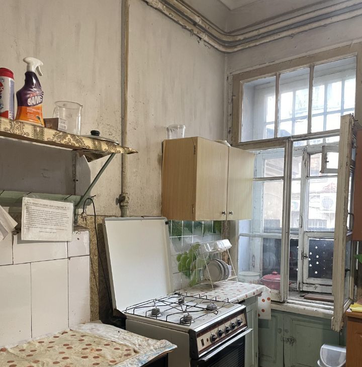 Светлая комната в малонаселенной , тихой коммунальной квартире . Вид из окна в большой двор, в комнате установлен кухонный уголок, укомплектована также посудой! Мебель добротная, все необходимое для проживания имеется.