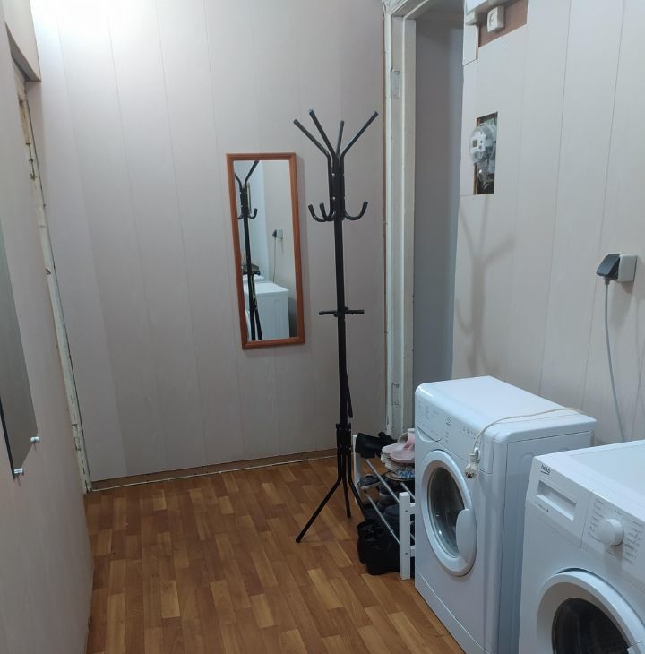 В комнате есть вся необходимая мебель: кровать, стенка со шкафом, стол и стулья и бытовая техника: стиральная машина, микроволновка и холодильник.