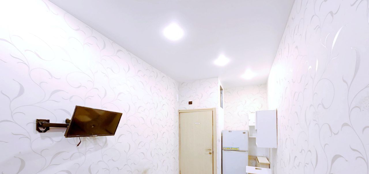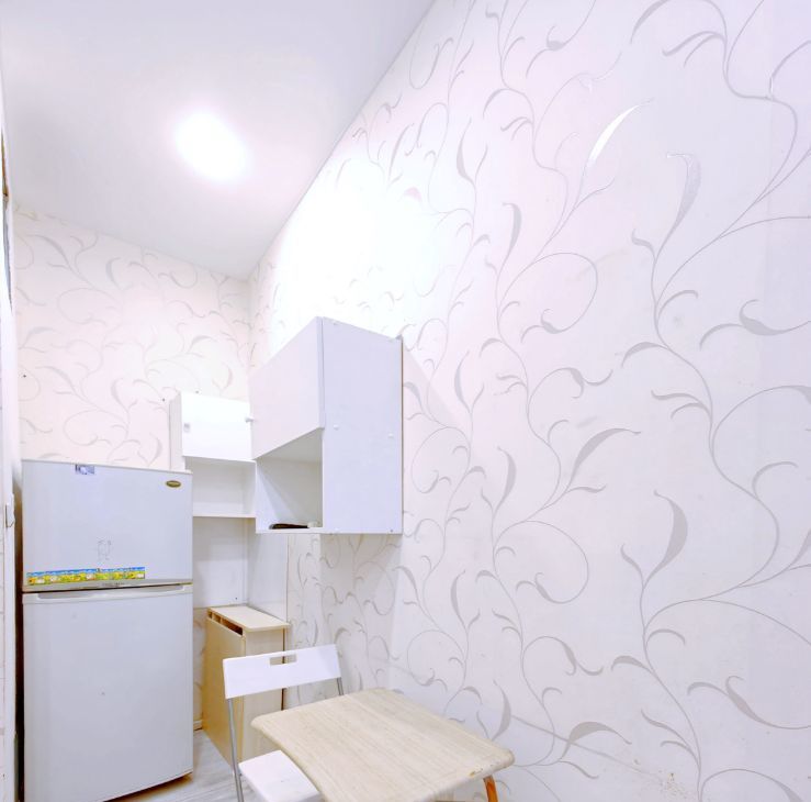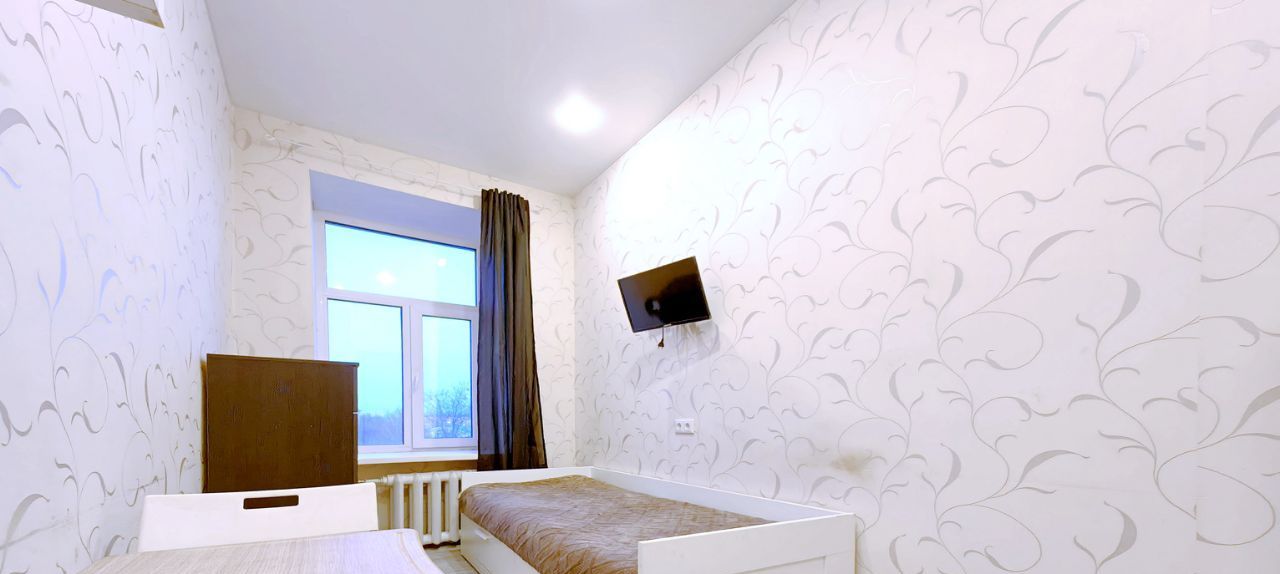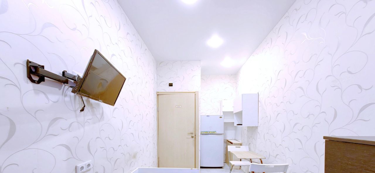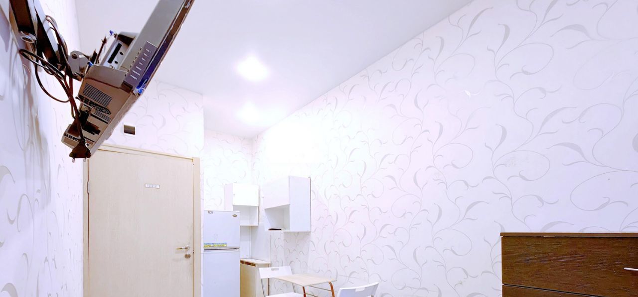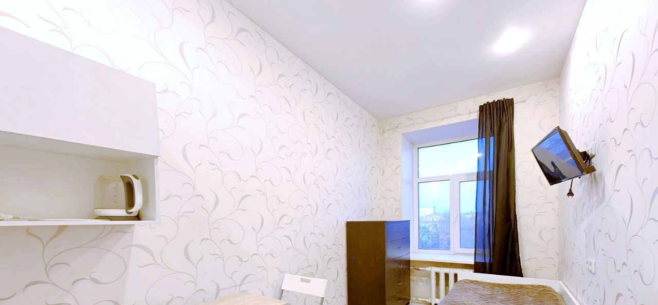 -В комнате есть: Односпальная Кровать, стол+стулья, комод, телевизор, холодильник, чайник, микроволновка.
