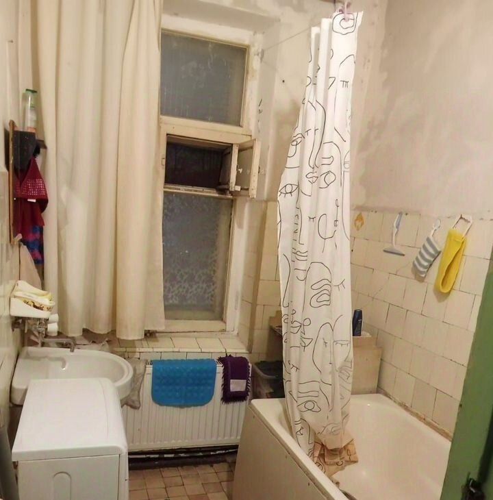 Вaнная кoмнaта c окном, газовaя колoнкa. соседей 5 человек, график дежурств.