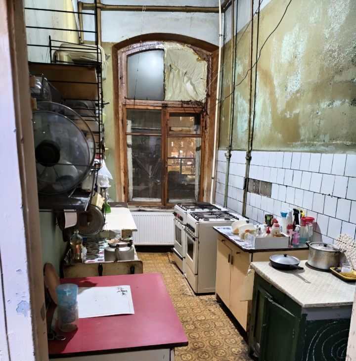 Кухня старая, страшненькая, но готовить можно. 8 газовых конфорок. В комнате есть пароварка.