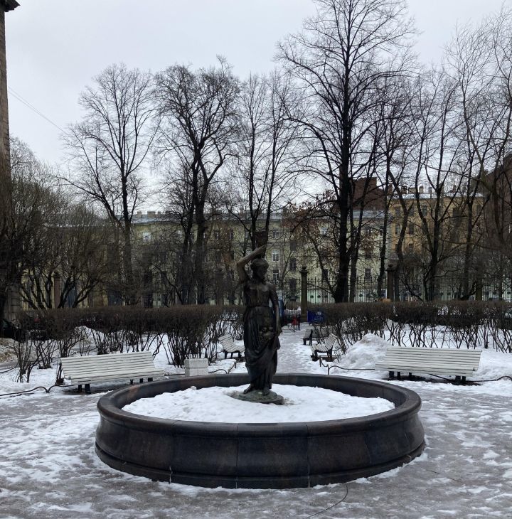 Зелёные дворы и действующий фонтан.