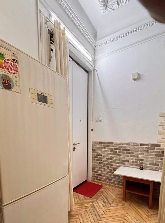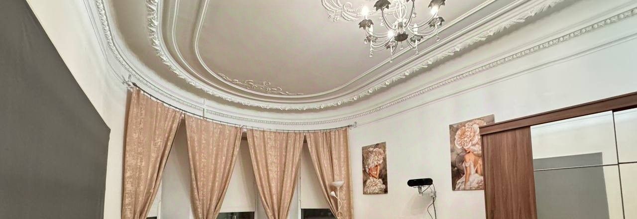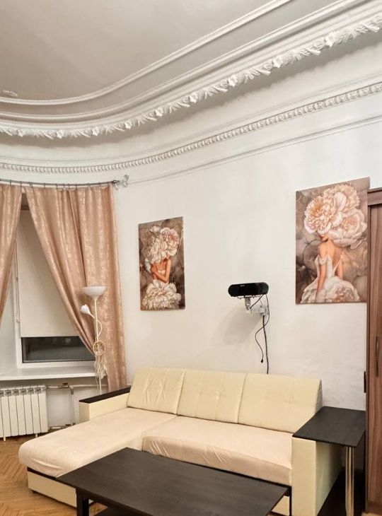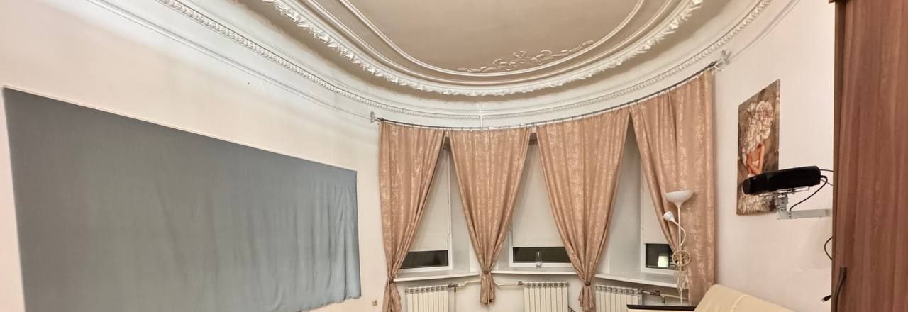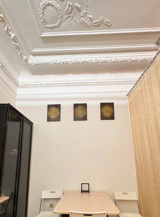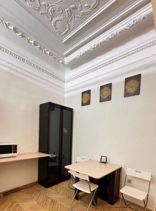 Потолки под 3 метра дарят ощущение свободы. Здесь легко дышится, есть место для занятий йогой или танцев. Удобный раскладывающийся диван, большой вместительный шкаф для вещей. Окна выходят в тихий двор-колодец — никакого шума проспекта, только покой. Дом с идеальным отоплением (зимой здесь жарко, проверено!), плесени и сырости нет — сухо и комфортно.