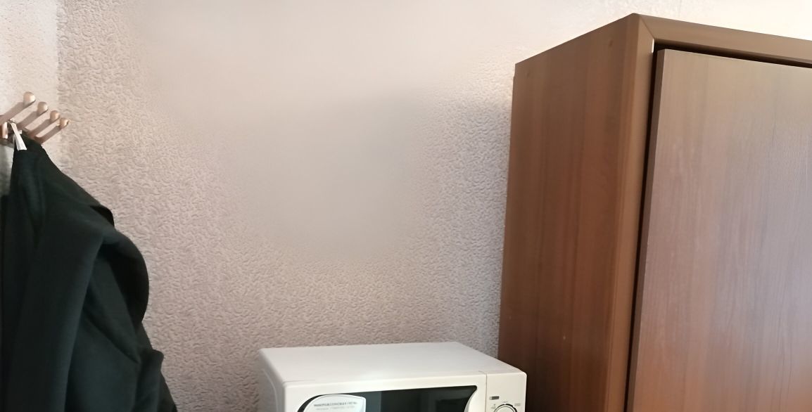 Холодильник и микроволновка в комнате.
