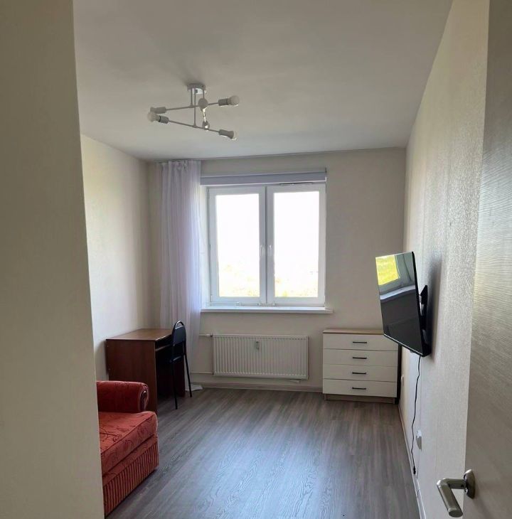 Комната большая и светлая , есть раскладной диван, комод,стол и большой телевизор.
