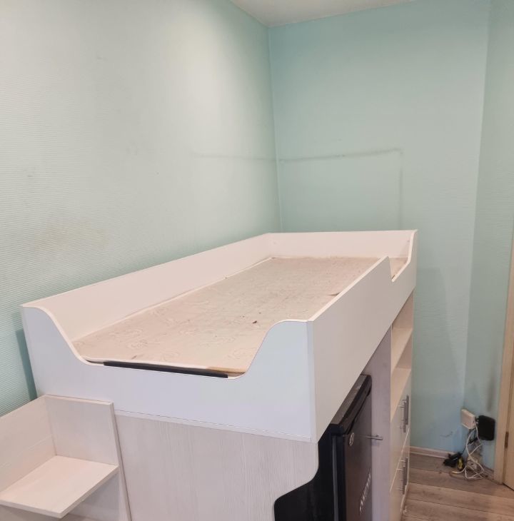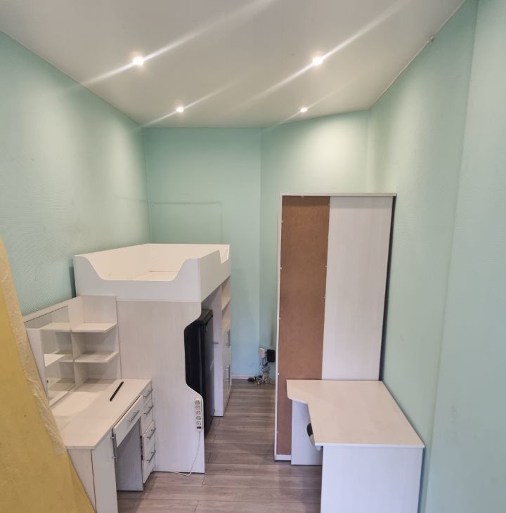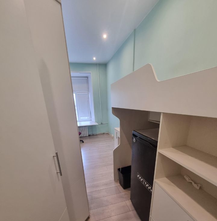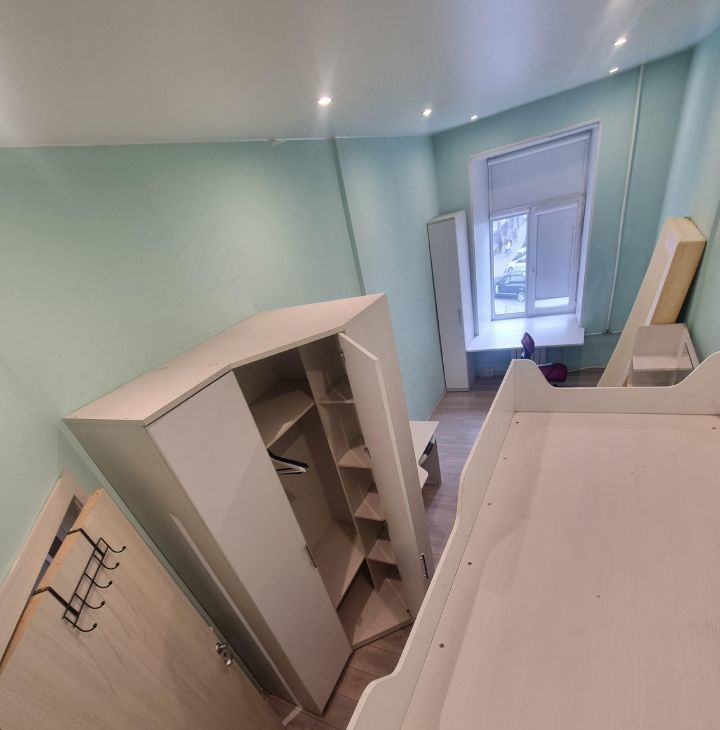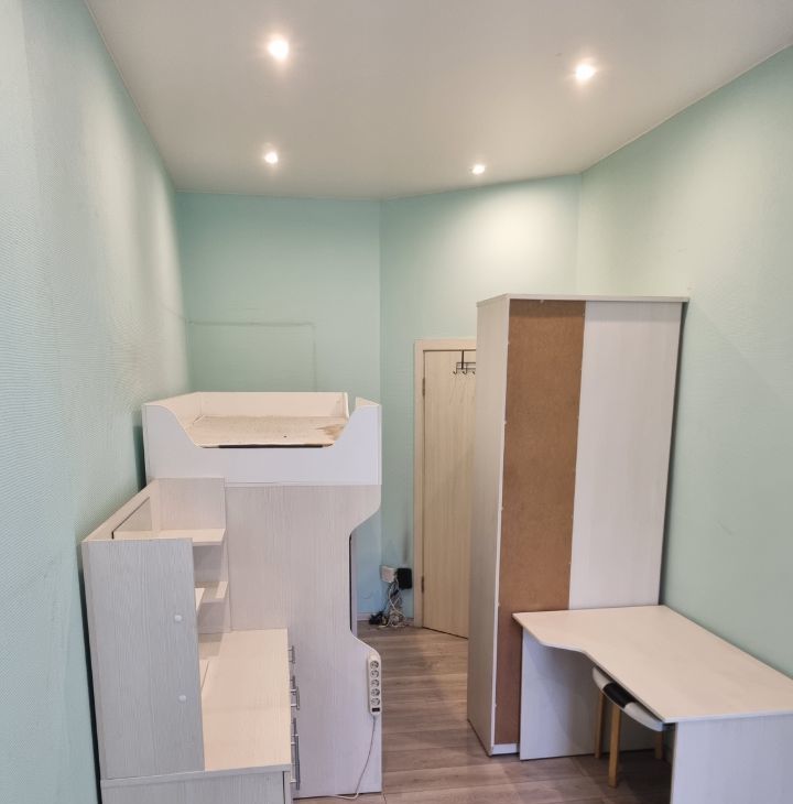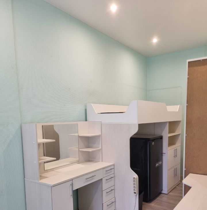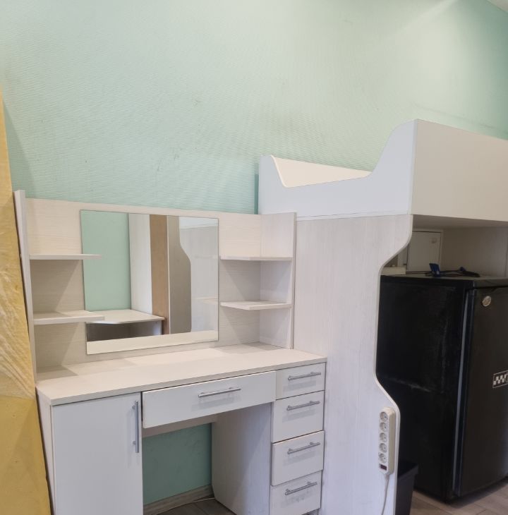 Комната светлая, с косметическим ремонтом и всей необходимой мебелью. Кровать на втором ярусе 90*200 см. Просторное рабочее место, много мест для хранения вещей, холодильник, туалетный столик с зеркалом. Есть небольшая прихожая на 2 комнаты.