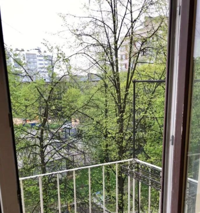 Балкон, окно в пол, вид на зелёный двор.