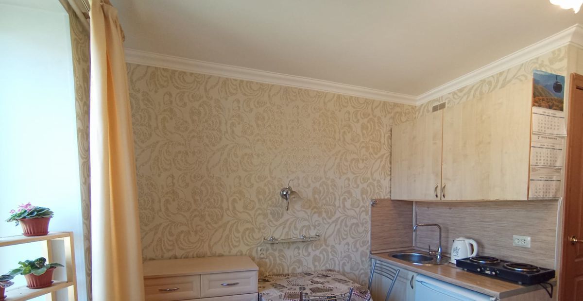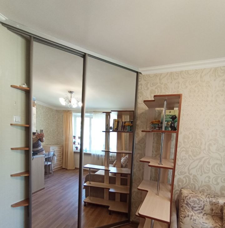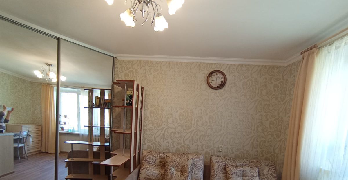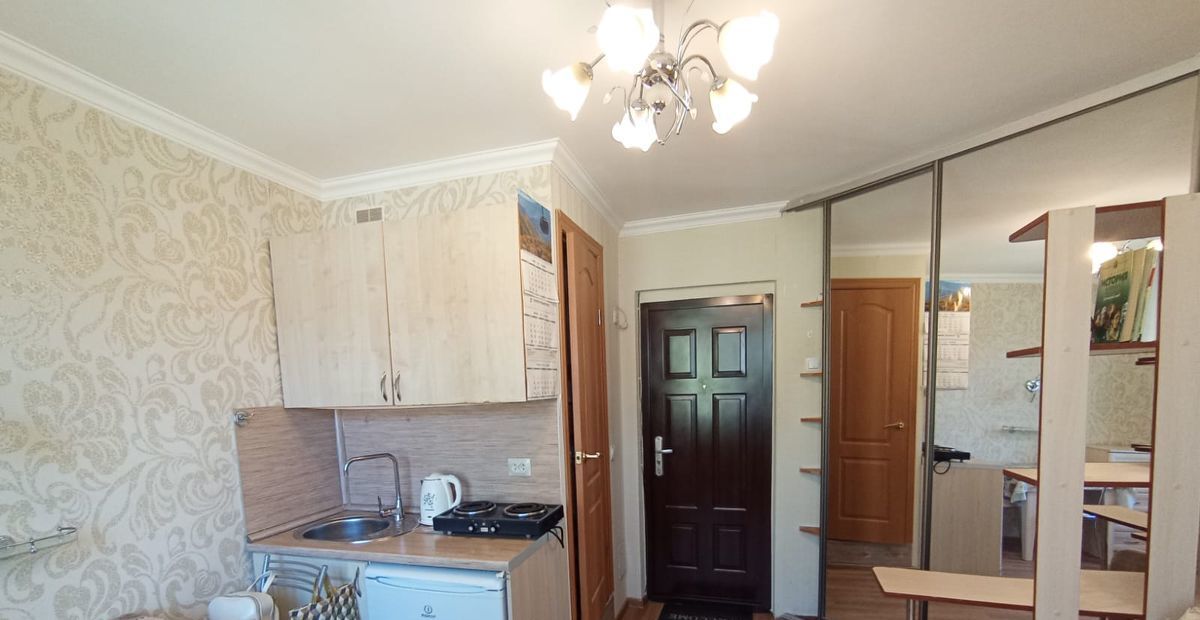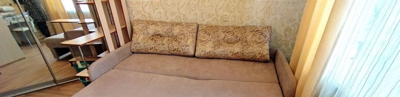 В комнате есть всё необходимое для жизни, качественная мебель (большой диван быстро превращается в 2-спальную кровать, шкаф-купе с зеркалами, комод, стол, стулья, кухонная мебель, холодильник, утюг, телевизор)