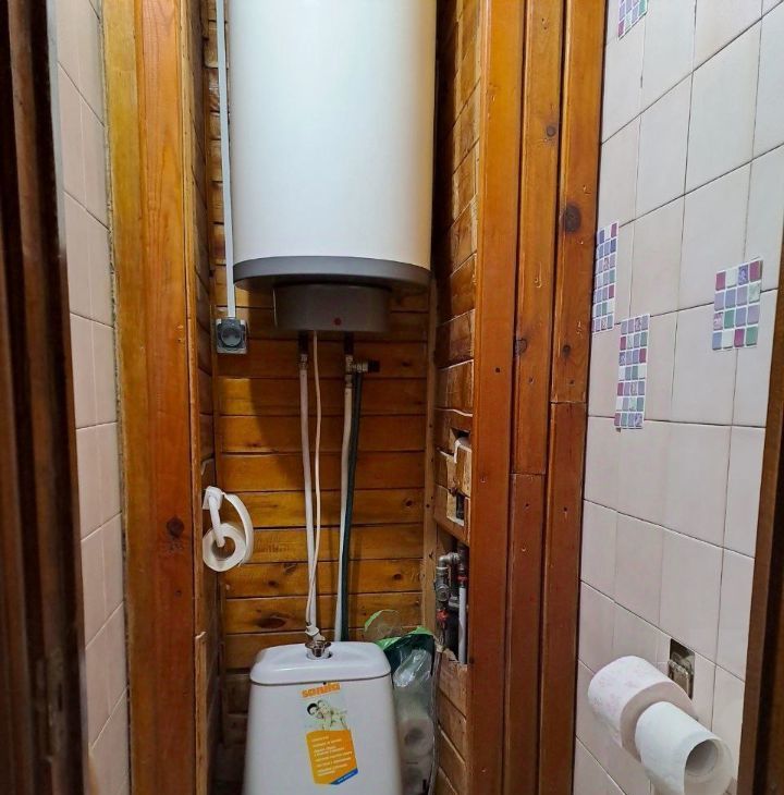 Ванна и туалет - раздельные (темно-бежевого цвета ванна из камня) , в кафеле. Горячая вода - центральное водоснабжение. Водонагреватель - для удобства.