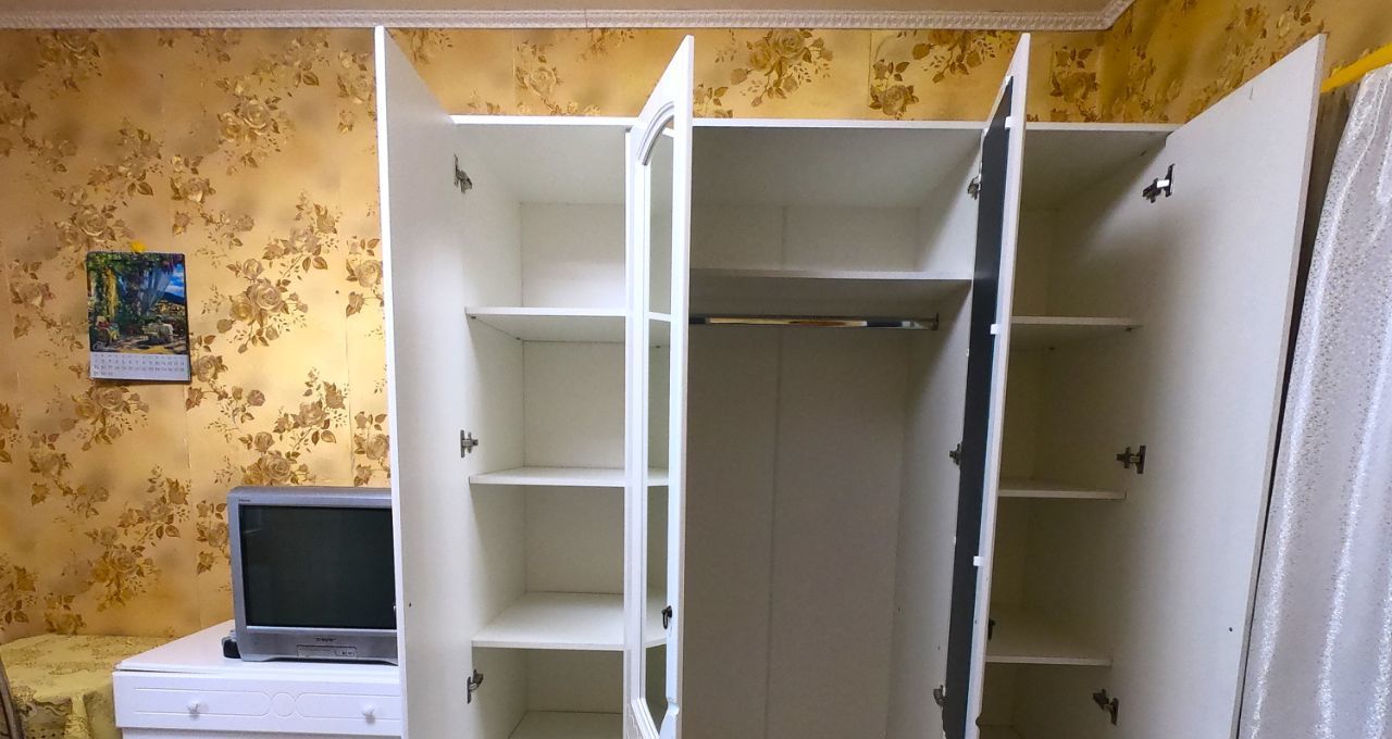 В комнате двуспальный раскладной диван, шкаф, комод, столик со стулом и телевизор