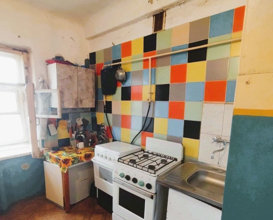 Большая общая кухня с четырехкомфорочными газовыми плитами, свой стол, своя стиральная машинка. В комнате холодильник, телевизор, необходимая мебель, интернет.