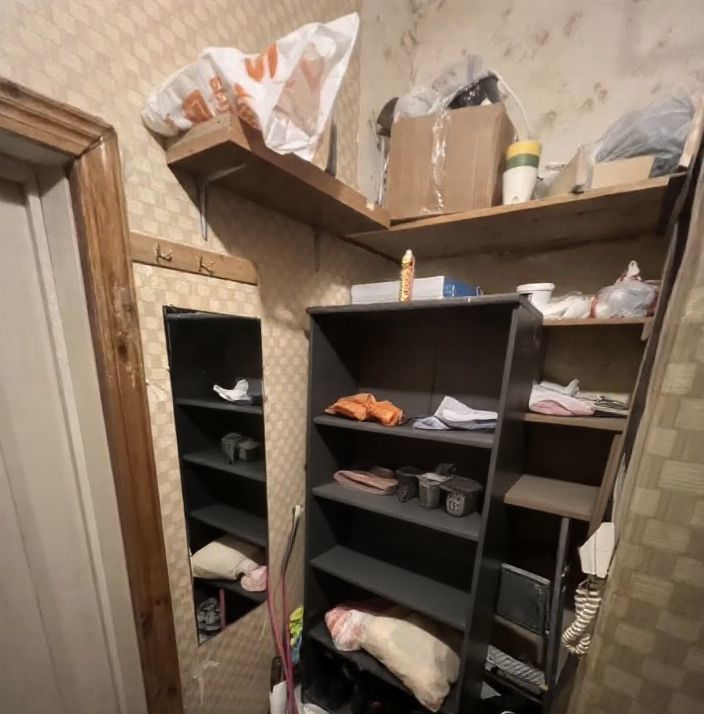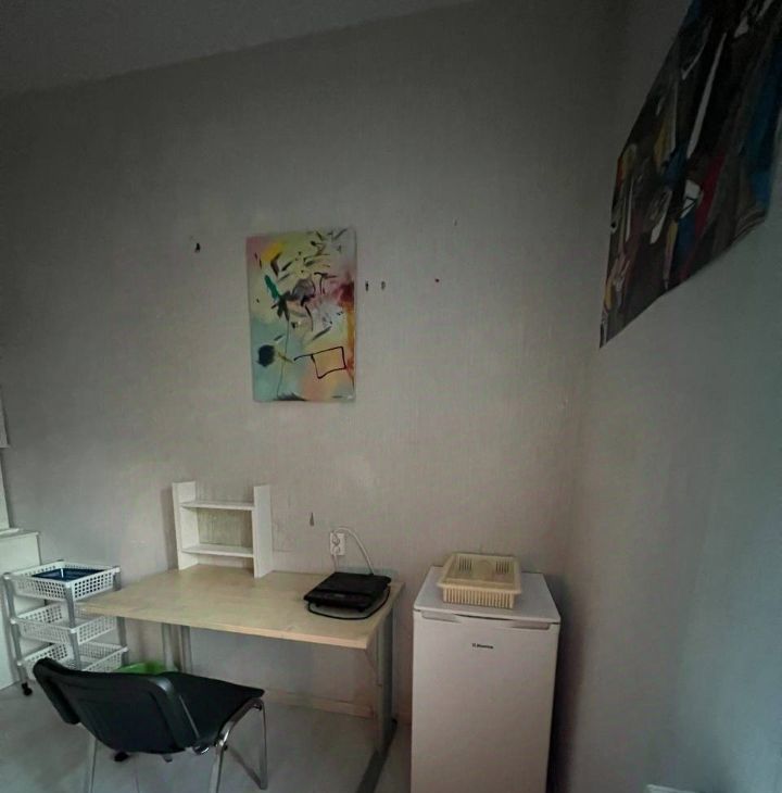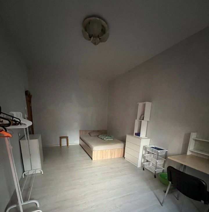 В комнате есть все что нужно для жизни: стол, 2 камода, стеллаж, 2 гардеробных вешалки, двухспальная кровать с удобным матрасом, индукционная плита