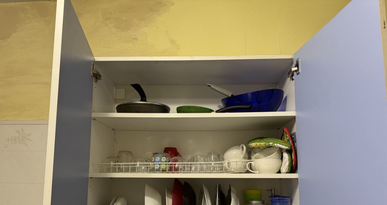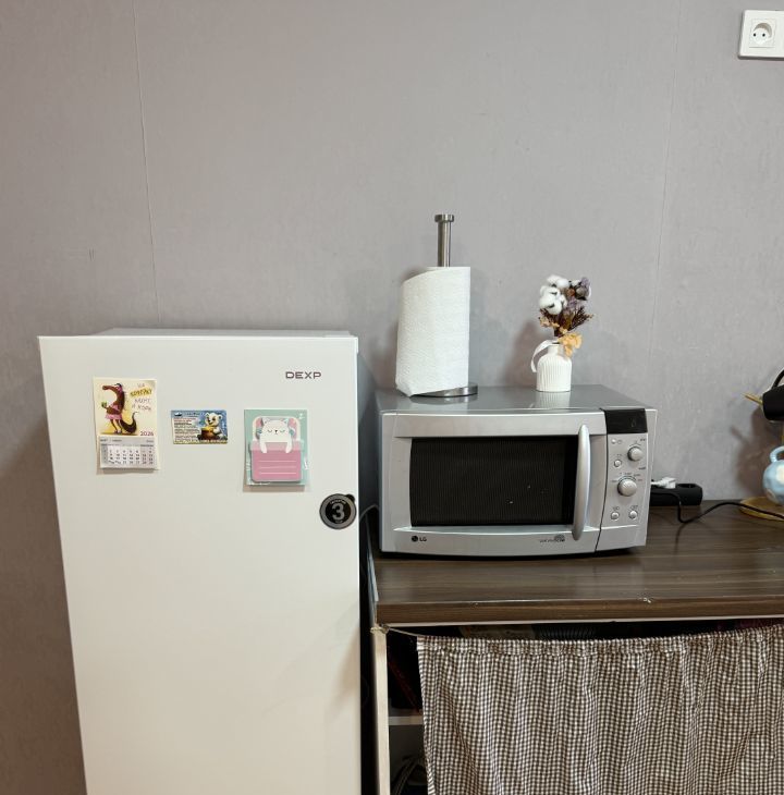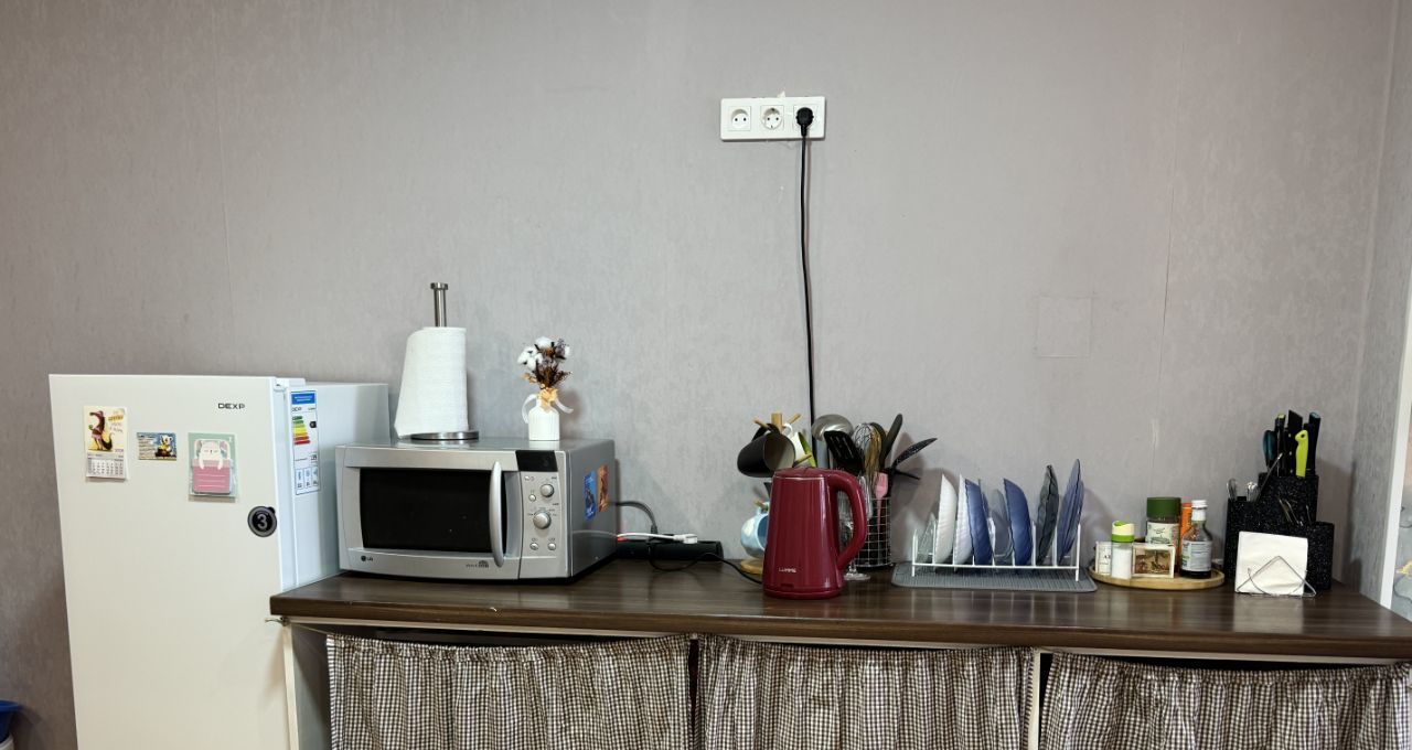 * Плюс с мини-кухне в комнате имеется стол на общей кухне и шкаф для посуды, то есть можно готовить там, где удобнее, везде все условия есть