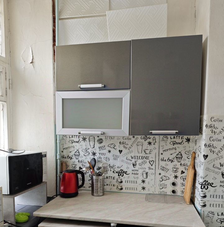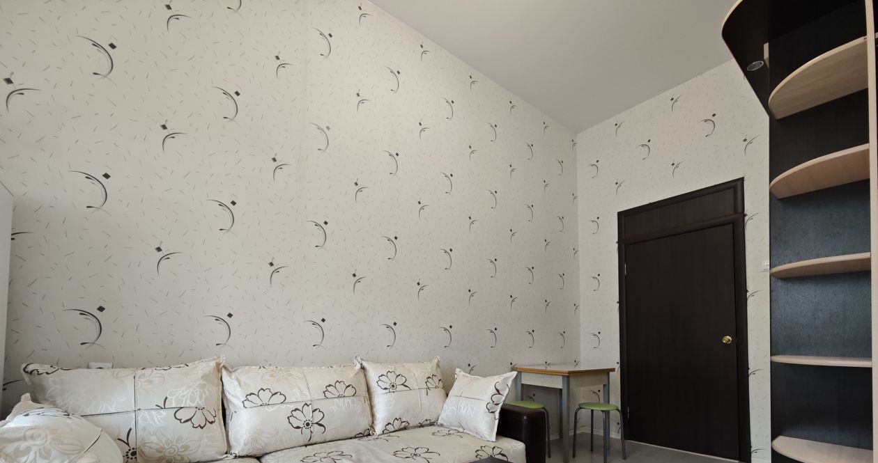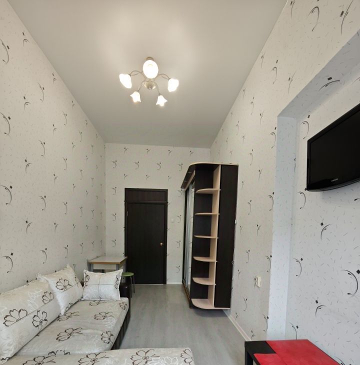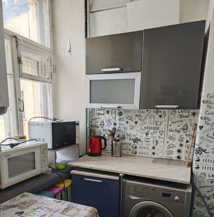 В комнате есть всё необходимое: диван, холодильник, телевизор, обеденная зона. На кухне стиральная машина Бош и микроволновая печь. Есть вся посуда.