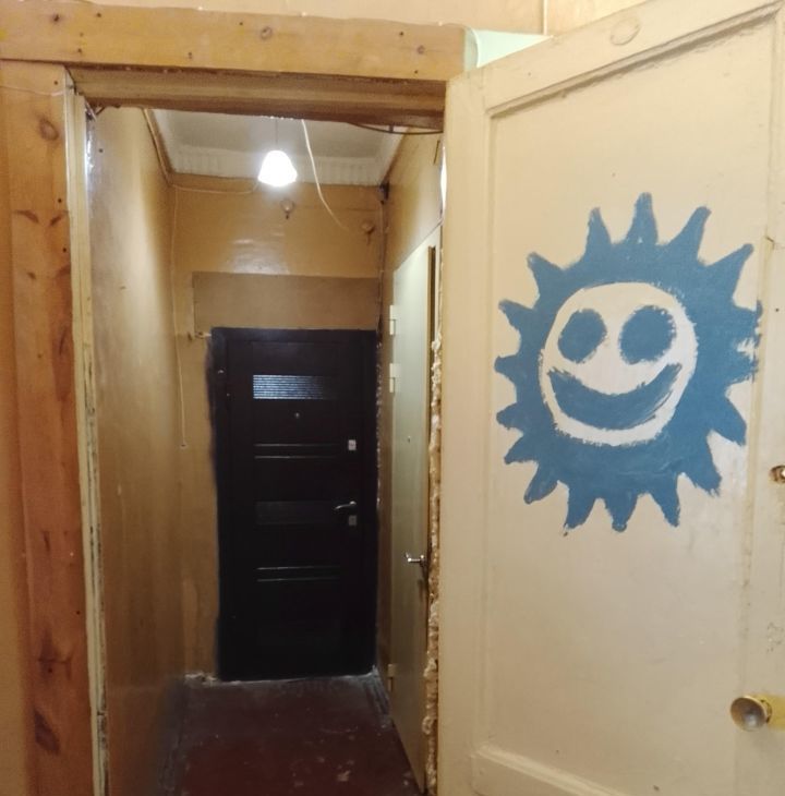 Комната отделена от общего коридора тамбуром с дверью (на фото с синим солнышком)