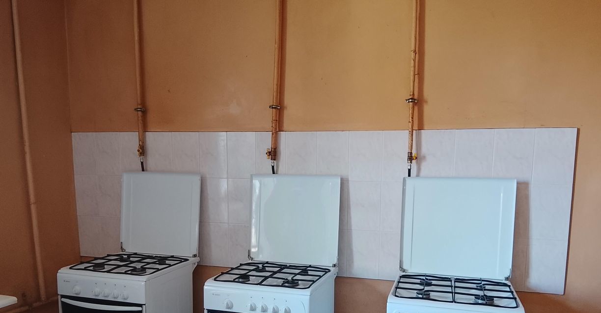 Есть диван, шкаф, холодильник, стол, чайник.