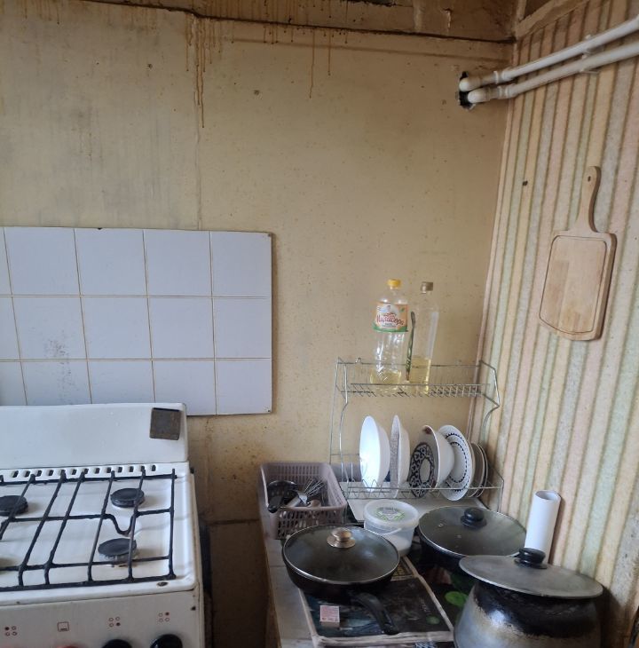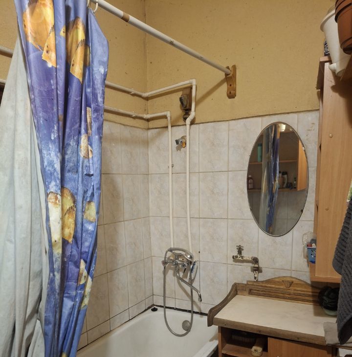 Мебель на кухне и в ванной старая, темновато в МОПах, но все на месте и в рабочем состоянии, соседи убираются за собой. Стиралка общая, стол на кухне пока занят соседями тк давно никто не жил. Есть доп. место для хранения в коридоре.