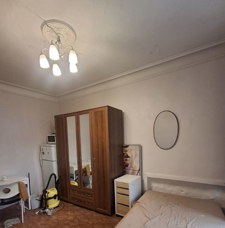 В комнате есть все необходимое для жизни: кровать, письменный стол, стулья, большой шкаф, столик и тумбочка, микроволновка, чайник, холодильник. В квартире раздельный санузел.