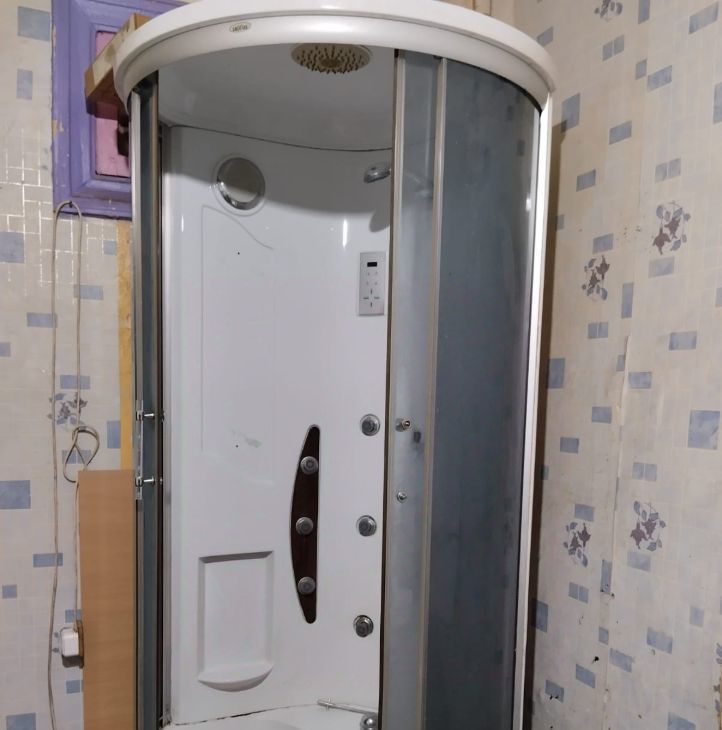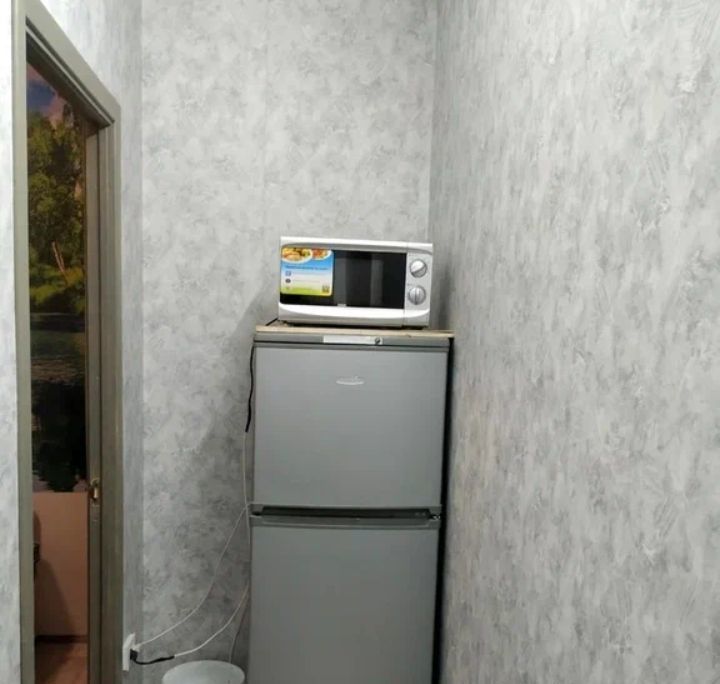 В нём распологается микроволновая печь, электрический чайник и двухкамерный холодильник на две комнаты.