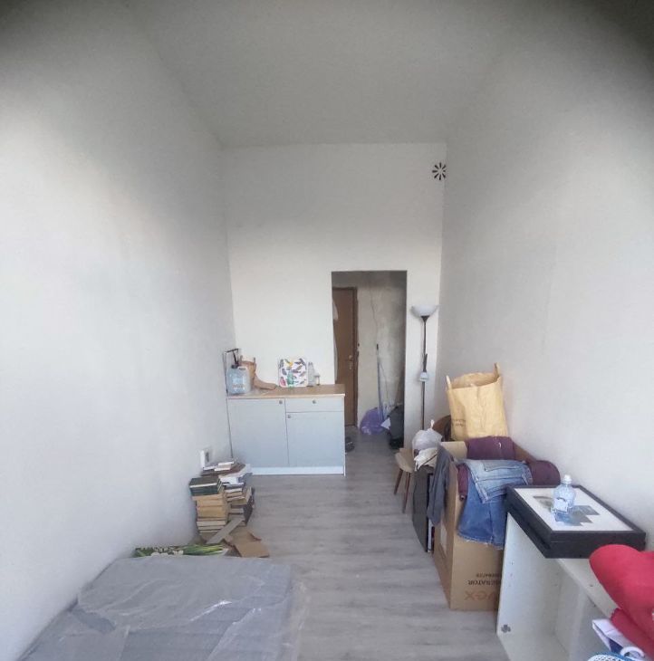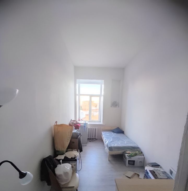 Площадь 14,1м2; потолки 3,4м; комната правильной прямоугольной формы, есть небольшой тамбур = гардеробная, большое окно (пластик), металлическая входная дверь, ламинат, новая кровать и матрас икеа.
