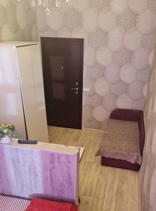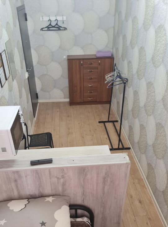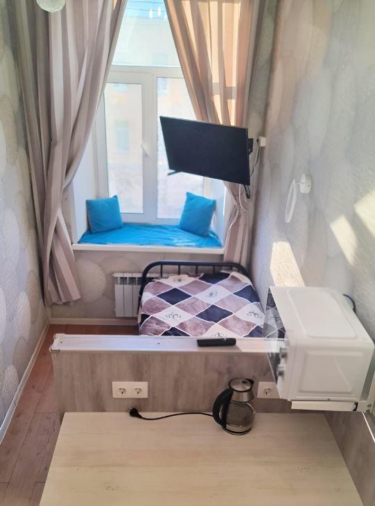 В комнате кровать,тахта,шкаф,телевизор, микроволновка, чайник, холодильник, комод.
