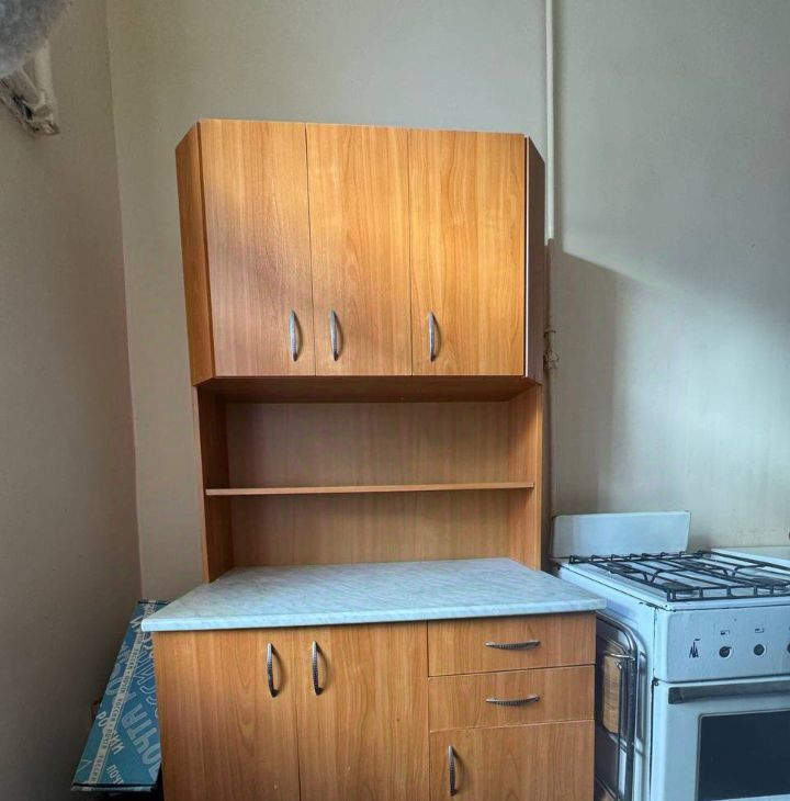 В комнате есть раскладной диван, большой шкаф, холодильник, микроволновка и чайник.